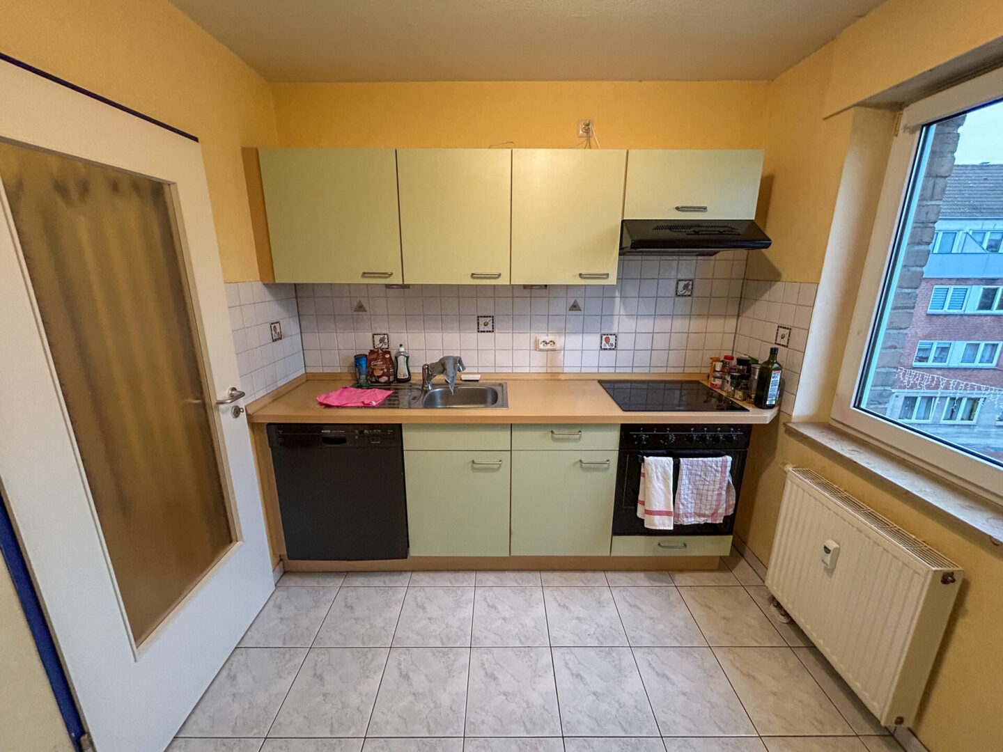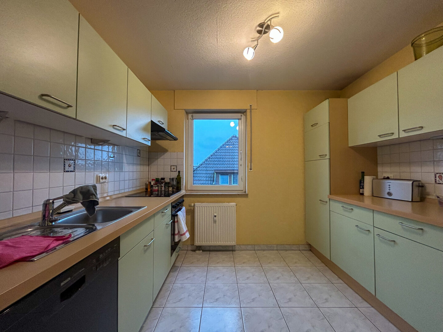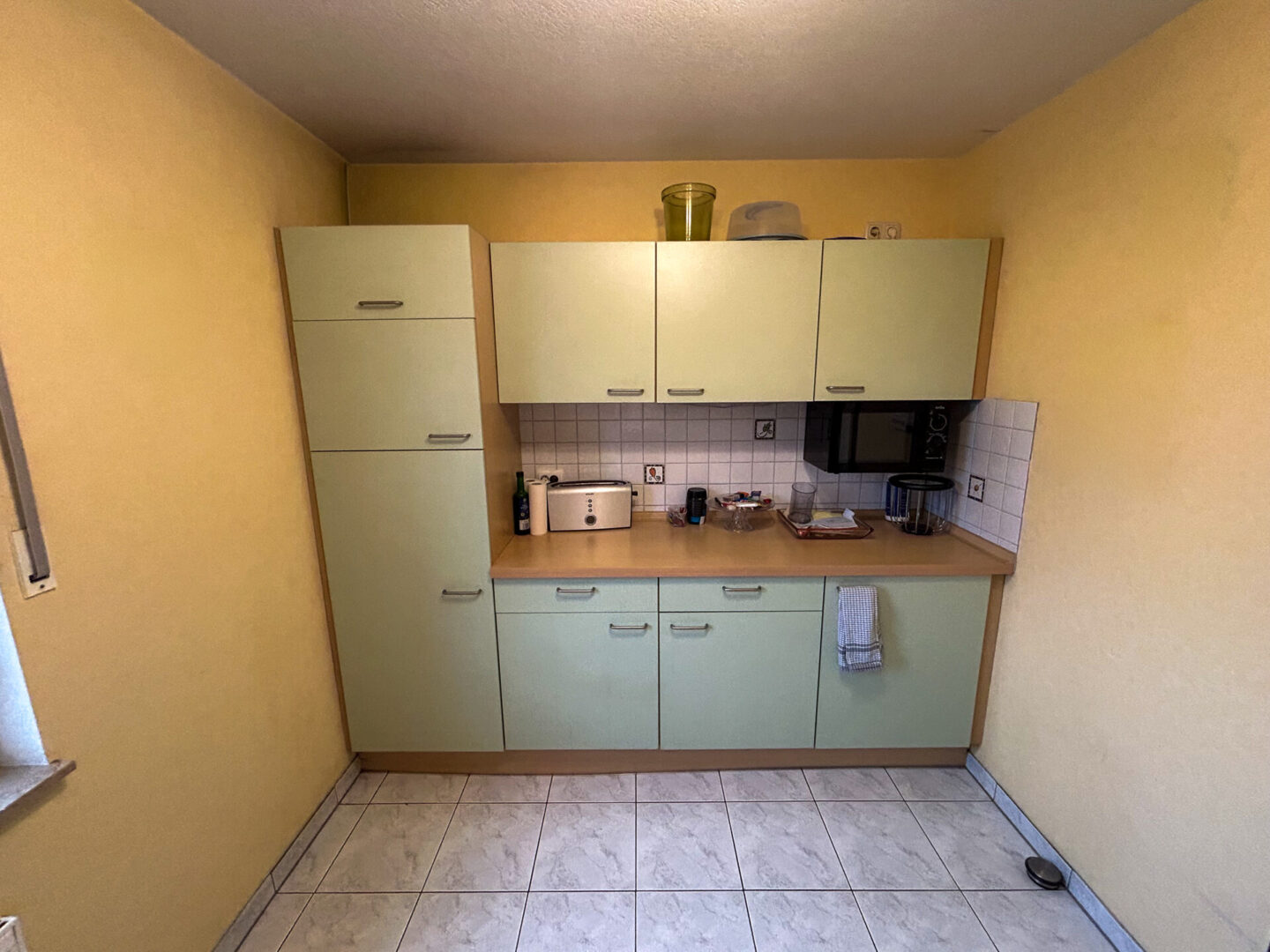 Die ebenfalls mit 30 × 30 cm grauen Fliesen ausgestattete Küche bietet eine im Kaufpreis enthaltene Einbauküche samt Elektrogeräten sowie einen pflegeleichten Fliesenspiegel.