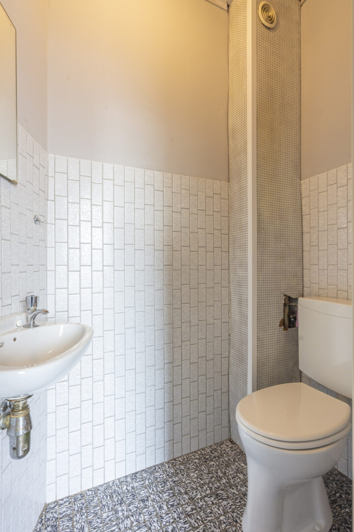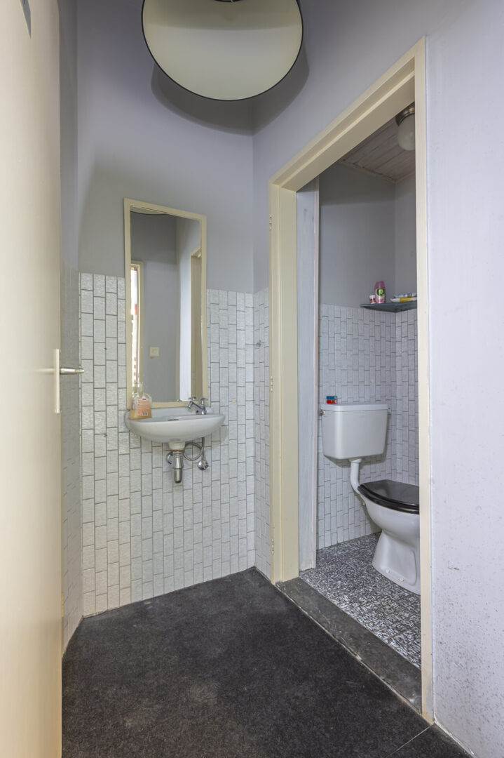 Über einen Durchgangsbereich gelangt man zum Gäste-WC mit Stand-WC und Handwaschbecken.