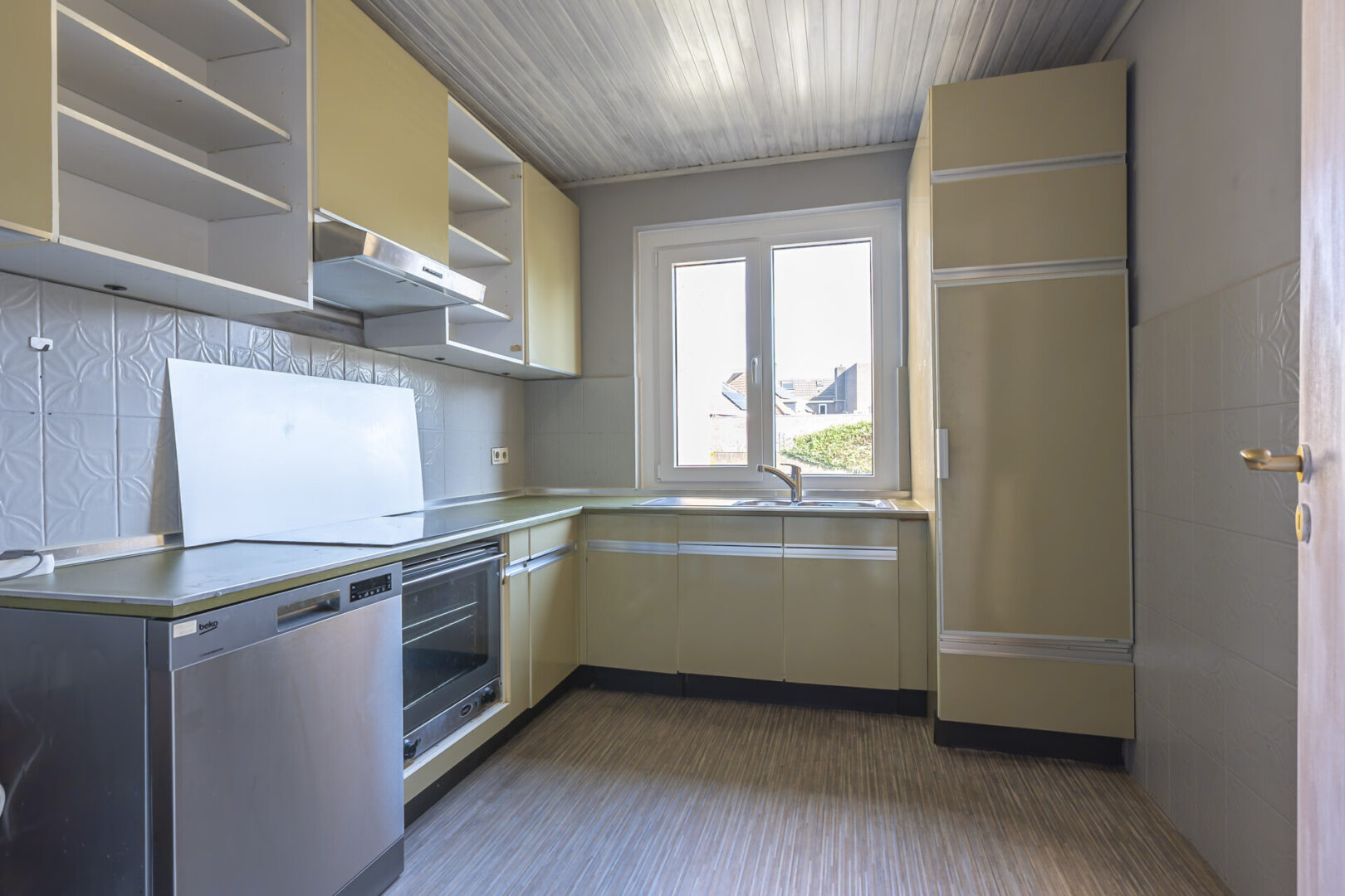 Die Küche misst ca. 8 m² und verfügt über eine L-förmige Küchenzeile mit folgender Ausstattung: Elektroherd, Dunstabzug, Geschirrspüler, Backofen und Kühlschrank.