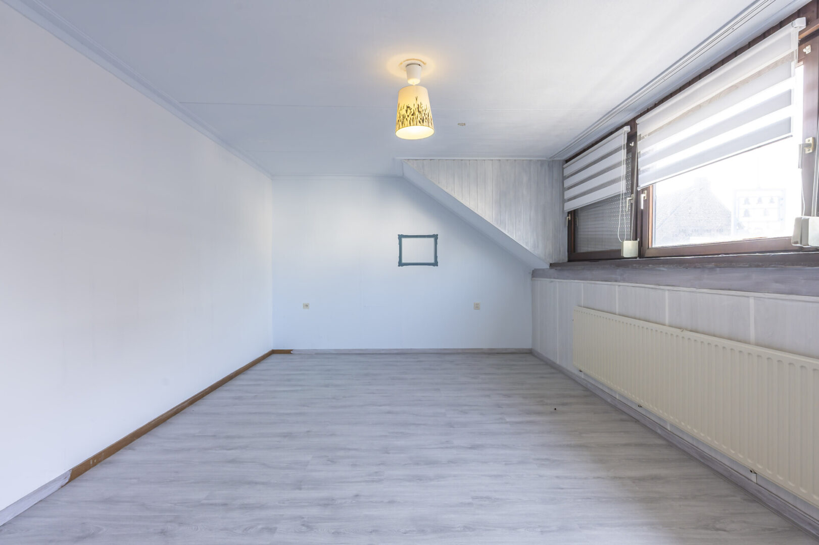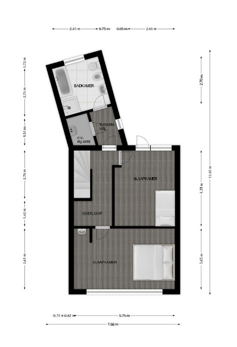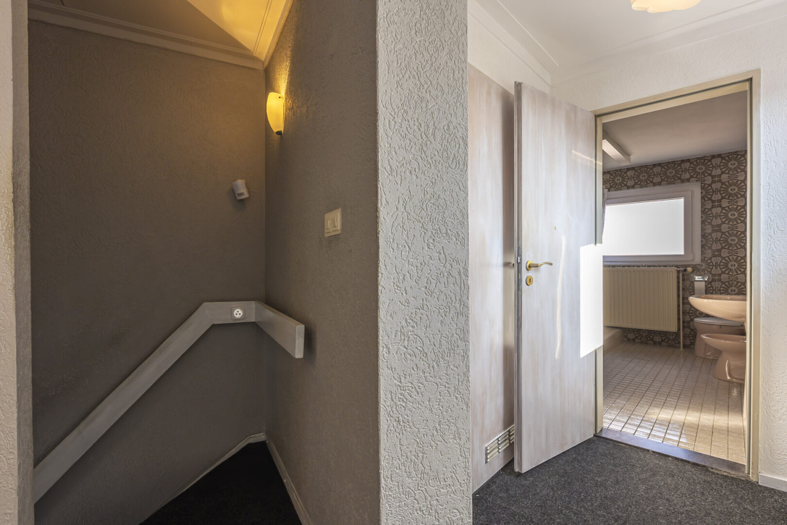 Über eine weitere Treppe erreichen Sie die zweite Etage, in der sich das Badezimmer, zwei Schlafzimmer und der Heizungsraum befinden.