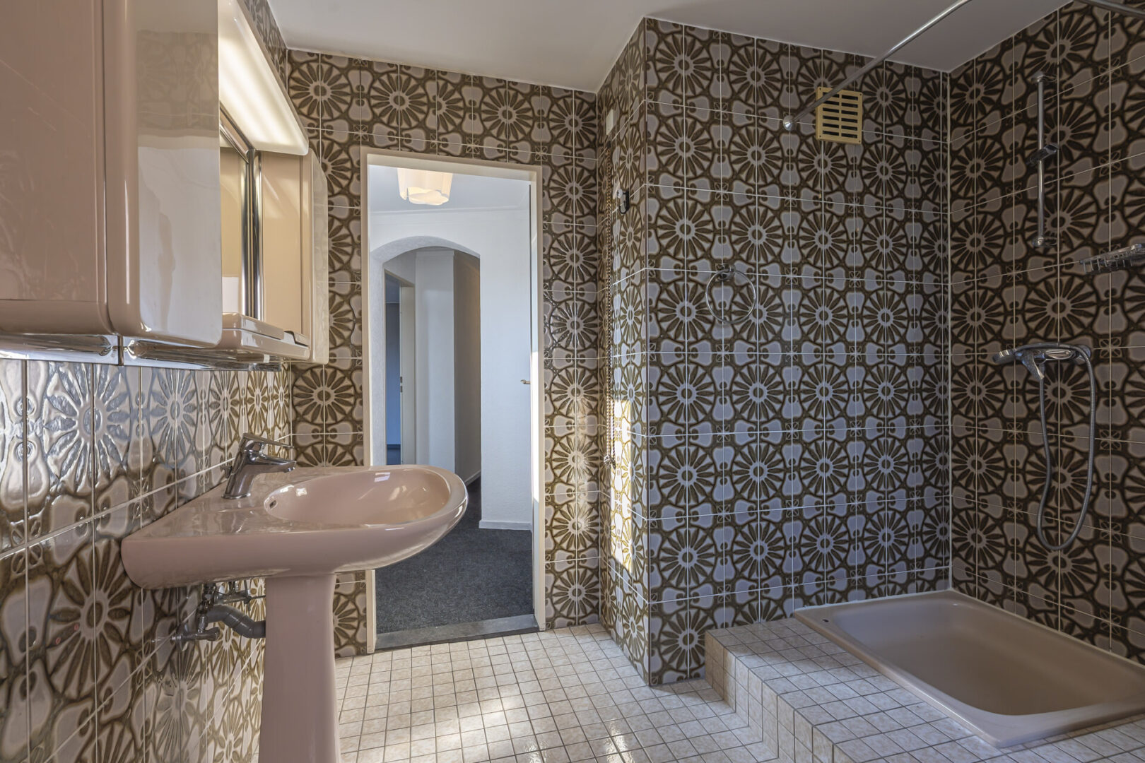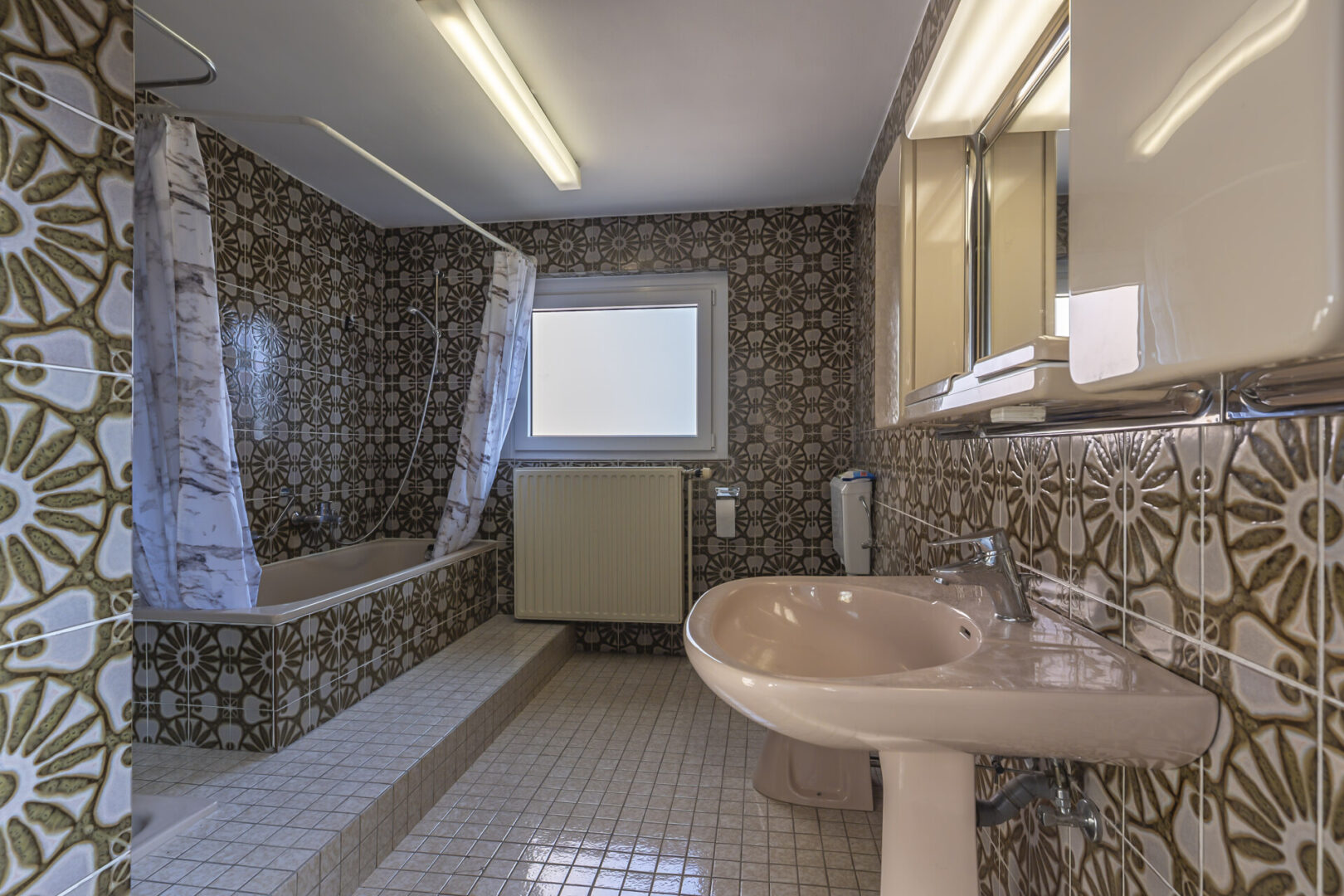 Das komplett geflieste Badezimmer ist ca. 8 m² groß und ausgestattet mit Badewanne, Dusche, Waschbecken und WC.