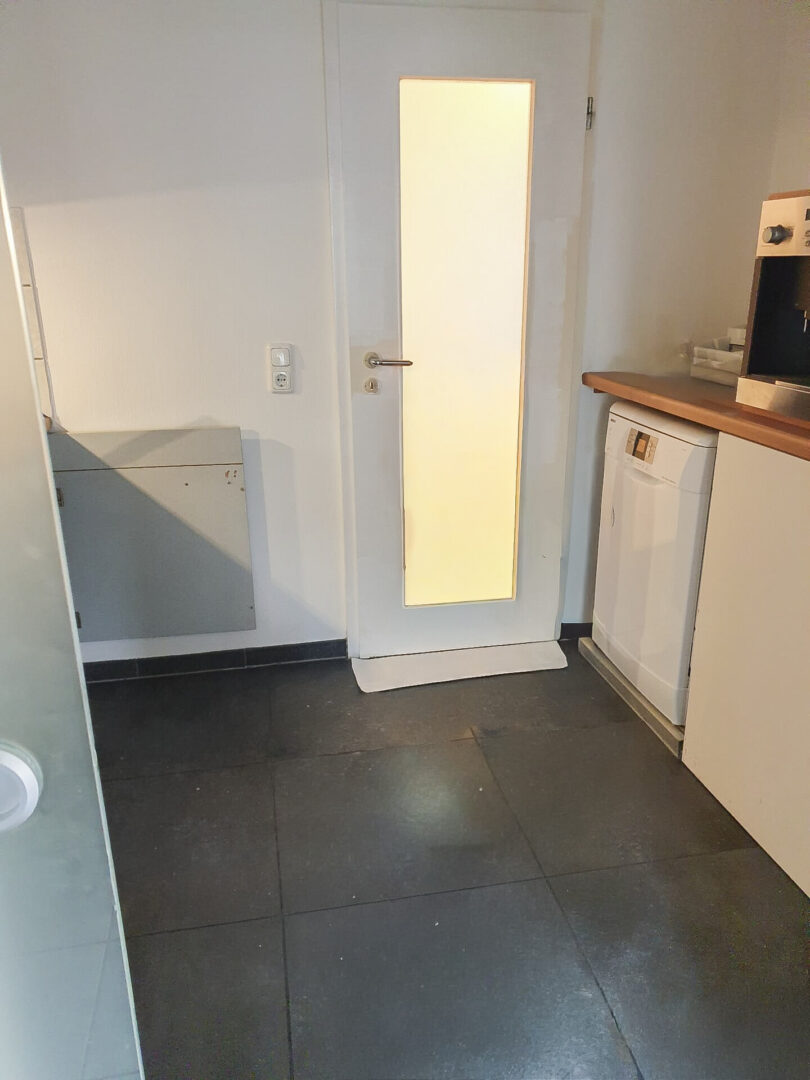 -Küche durch Trockenbauwand separiert, mit Glastür und Schiebetür, hochwertige, graue Bodenfliesen (60 × 60 cm, matt) in der Küche, Einbauküche mit buchenfront und weißem Korpus