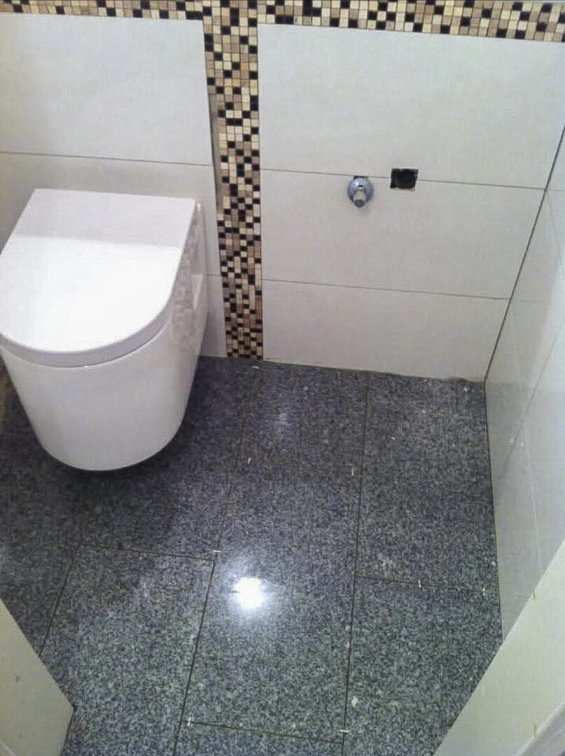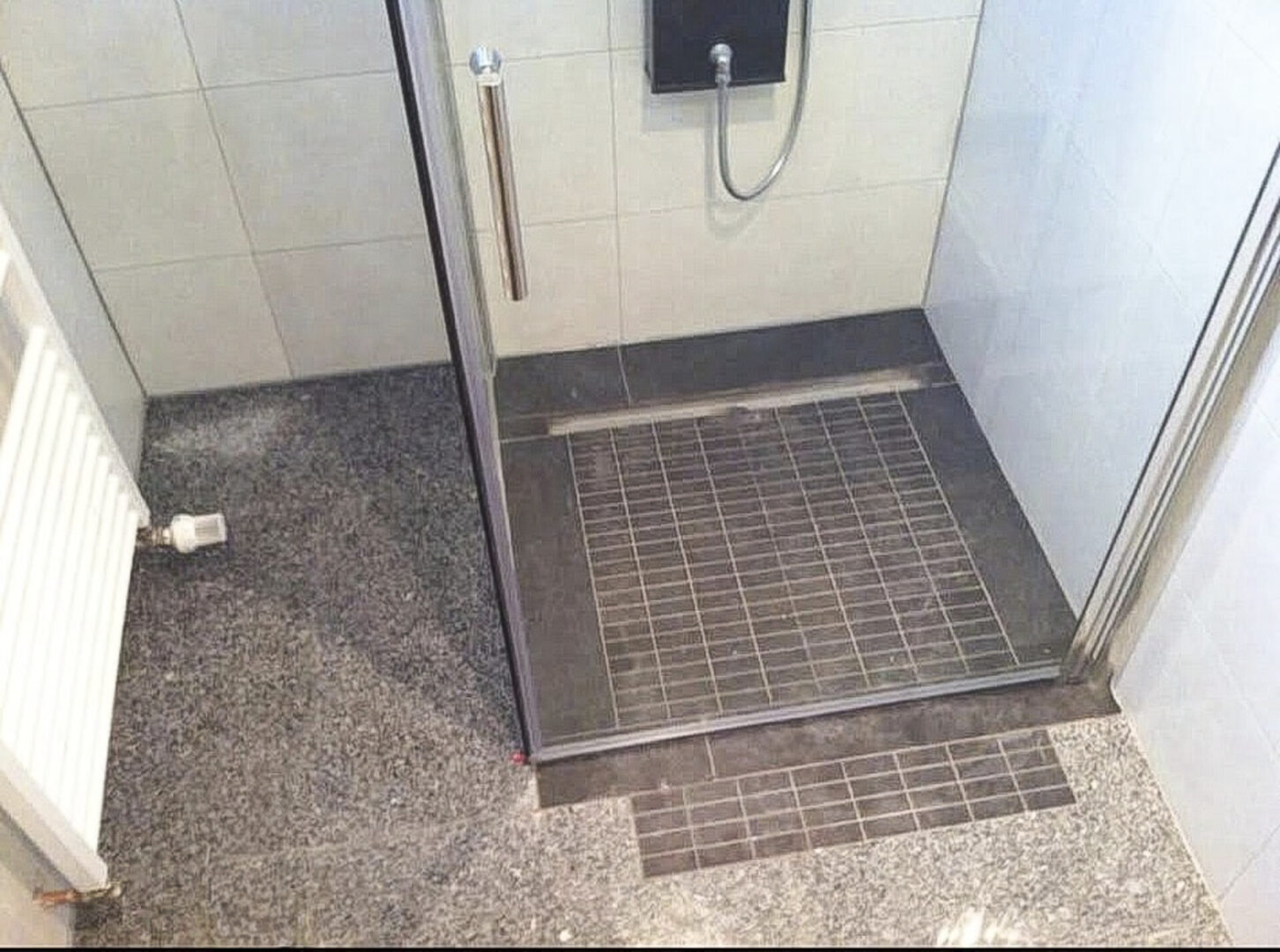 -Bad saniert mit ebenerdiger Dusche und bodentiefem Abfluss, Glasduschwand, großformatigen Wandfliesen (30 × 60 cm), edlem Granitboden Blue Tiger, neuer Türanlage, eigener Wasseruhr
