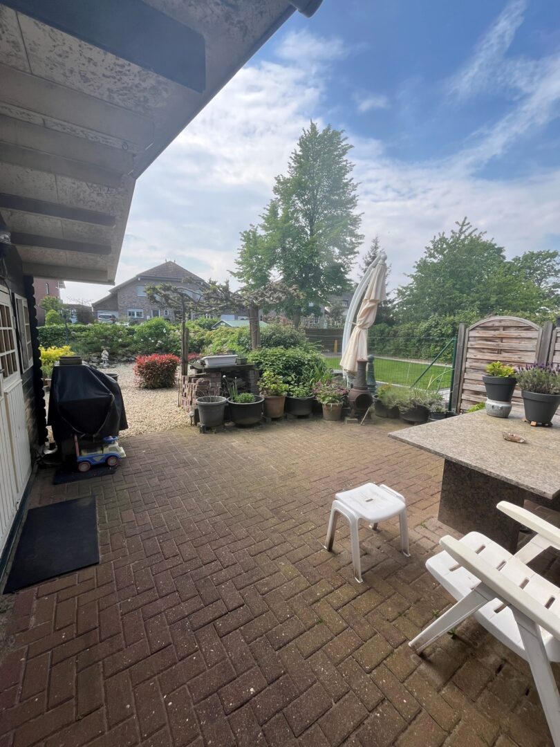 Der pflegeleichte Garten ist liebevoll gestaltet und bietet eine gepflasterte Terrasse mit einer angrenzenden Gartenhütte, die als Staufläche genutzt werden kann. Hortensien umrahmen ein charmantes Kies-Beet und verleihen dem Außenbereich eine idyllische Atmosphäre. Ein Weg führt zum nach hinten liegenden Gartentörchen, das einen alternativen Zugang zum Garten ermöglicht.