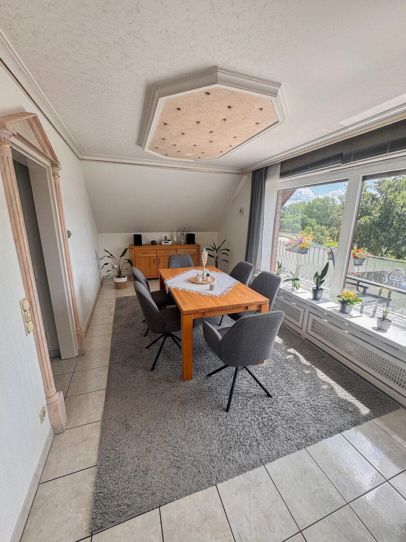 Das Wohn- und Esszimmer in L-Form ist mit zwei bodentiefen Fenstern, einer Glasschiebetür mit Rollladen und hochwertigen „Versace“-Markenfliesen ausgestattet. Stuckelemente in Säulenoptik und eine Decke mit Wickeltechnik prägen den Raum. Vom Wohnzimmer aus gelangen Sie direkt auf den Balkon in Südlage – ausgestattet mit einer elektrischen Markise und herrlichem Blick aufs Wurmtal.