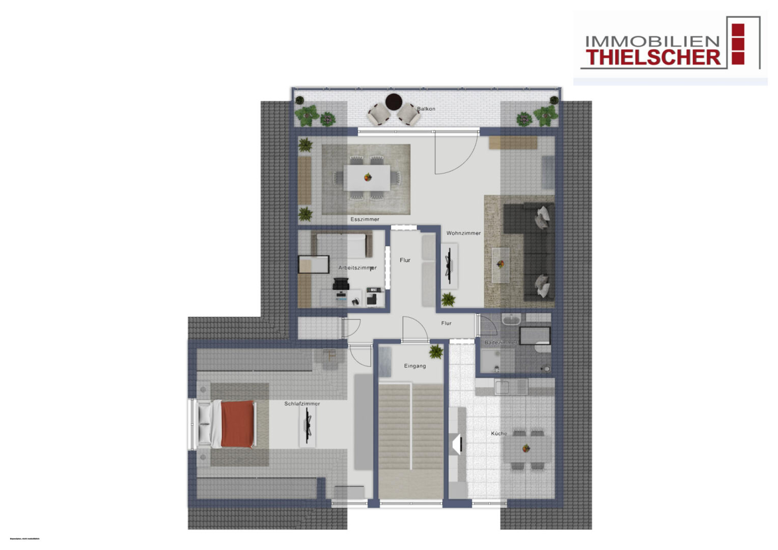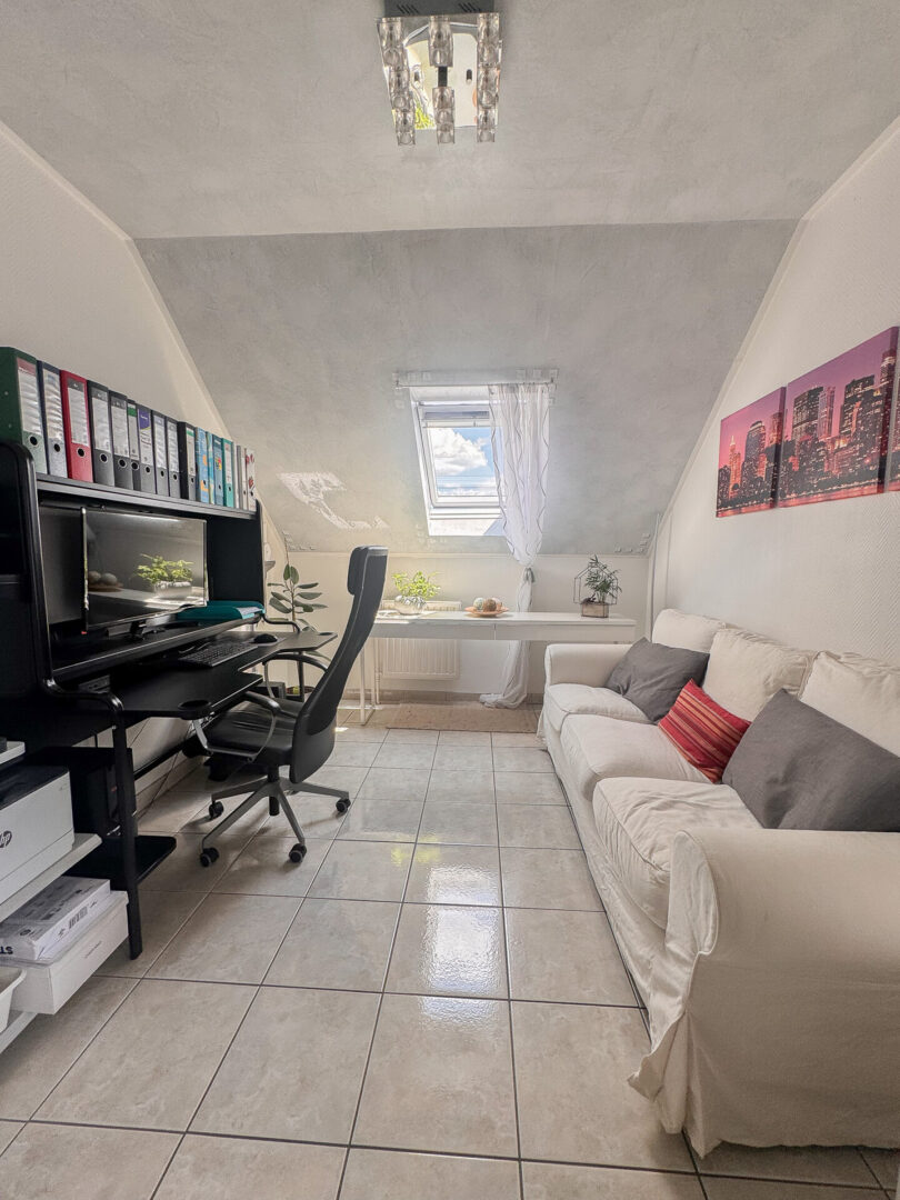 Bereits beim Betreten empfängt Sie die Diele, die mit einem hellen Fliesenboden und einer Vinyl-Schaumtapete gestaltet ist. Von hier aus sind alle Räume der Wohnung bequem erreichbar. Offen an die Diele angeschlossen befindet sich ein vielseitig nutzbarer Raum, der derzeit als Büro genutzt wird. Er könnte jedoch ebenso gut als Kinderzimmer dienen oder sogar als Küche, da entsprechende Anschlüsse vorhanden sind. In diesem Fall könnte man die bestehende Küche in ein Kinderzimmer umgestalten.