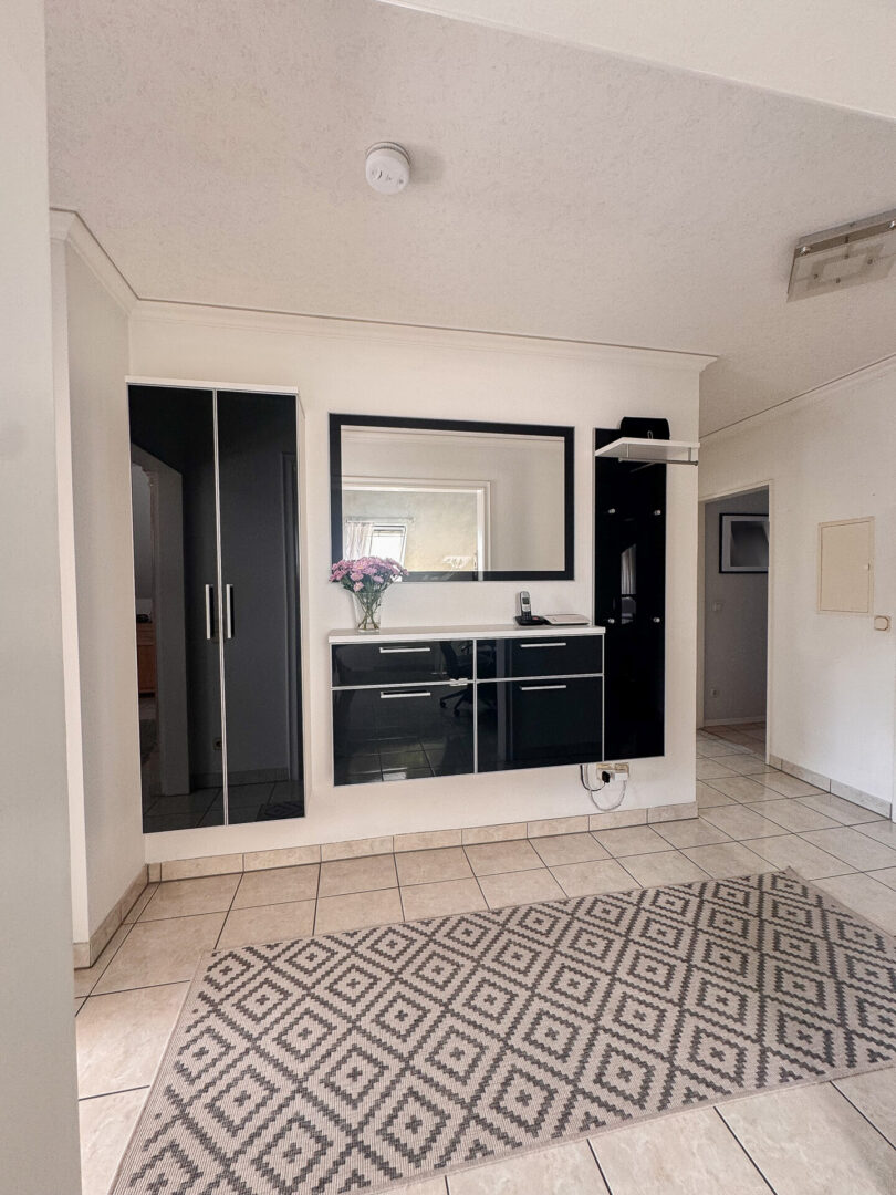 Ein kleiner Hauswirtschaftsraum innerhalb der Wohnung bietet zusätzliche Abstellfläche und beherbergt zudem die Gaskombitherme der Marke WOLF (Baujahr 2008), die ebenfalls für Warmwasser sorgt. Die monatlich zu erwartenden Heizkosten liegen bei etwa 80–100 €. Das Treppenhaus ist gepflegt – im unteren Bereich mit Spaltfliesen, im oberen Teil mit Teppichboden. Ein Stahlgeländer mit Kunststoffhandlauf, die weiße Wohnungstüre mit goldener Drückergarnitur sowie eine Gegensprechanlage vervollständigen das Gesamtkonzept der Immobilie.