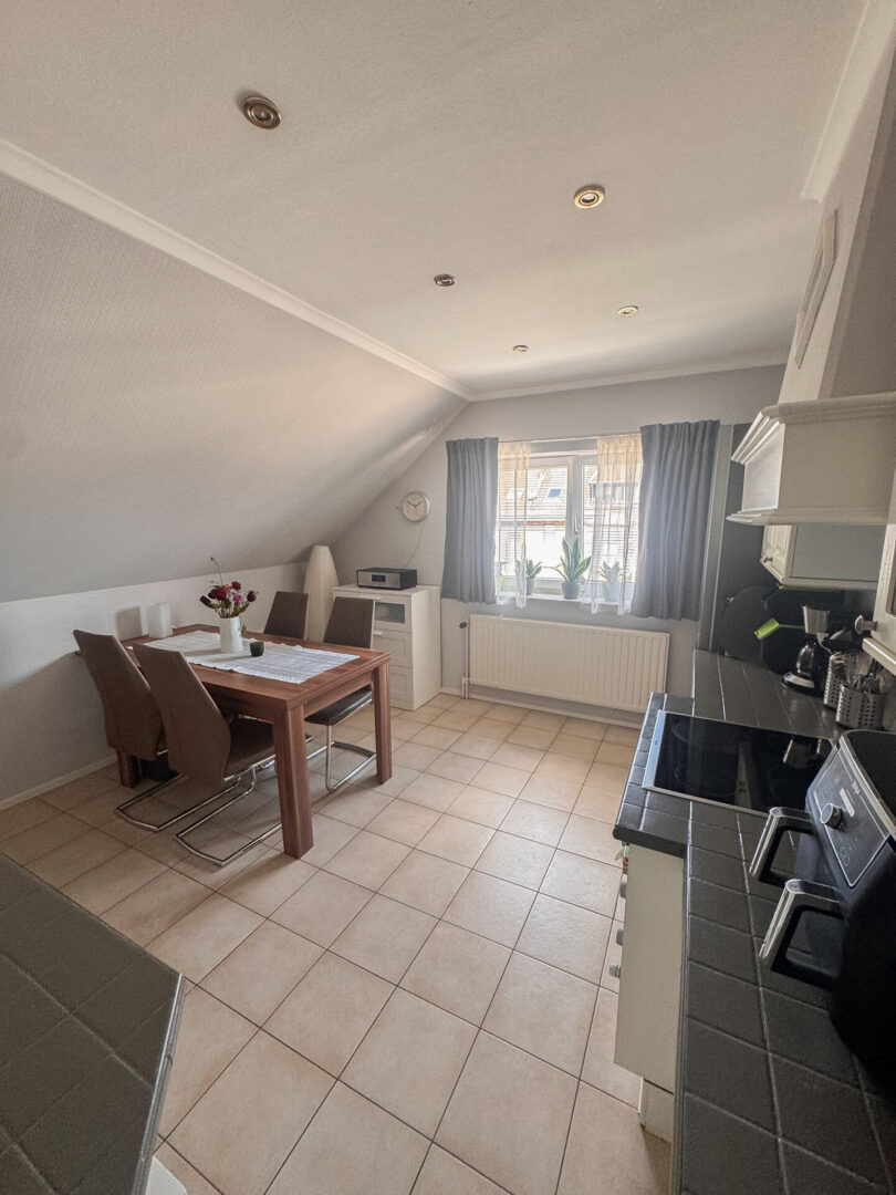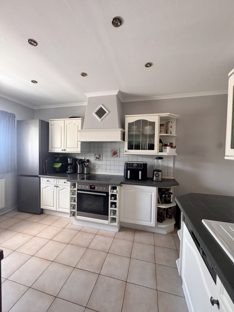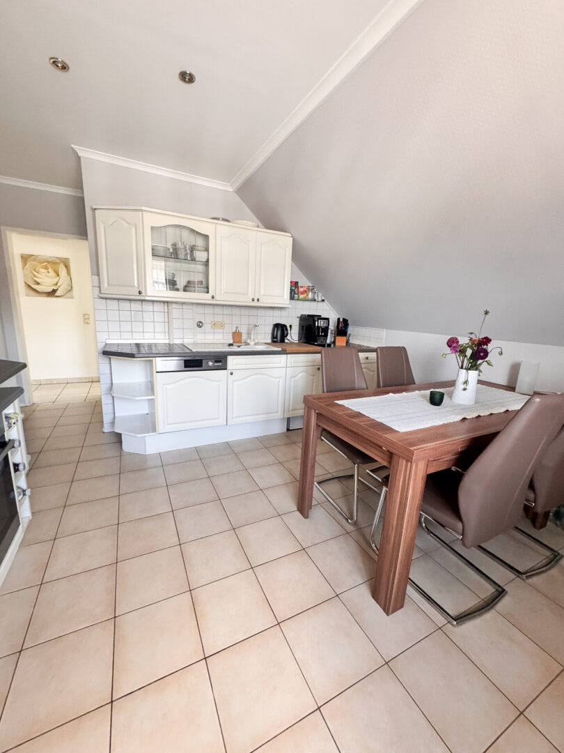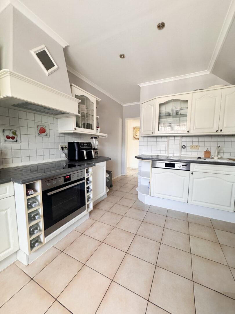 In der Küche befindet sich eine Einbauküche mit weißen Stilfronten, einer gefliesten Arbeitsplatte in Anthrazit, einem AEG-Backofen, einem passenden AEG-Ceranfeld und einem Kühlschrank. Die Küche verfügt über Abluft. Der Boden ist hellbraun gefliest (30 × 30 cm). Doppelt verglaste Holzfenster mit Marmorfensterbänken, ein weißer Fliesenspiegel (10 × 10 cm) sowie Strahler in der Decke gehören ebenfalls zur Ausstattung. Die Küche bietet ausreichend Platz für einen großen Esstisch und die Drempelhöhe beträgt ca. 130 cm.