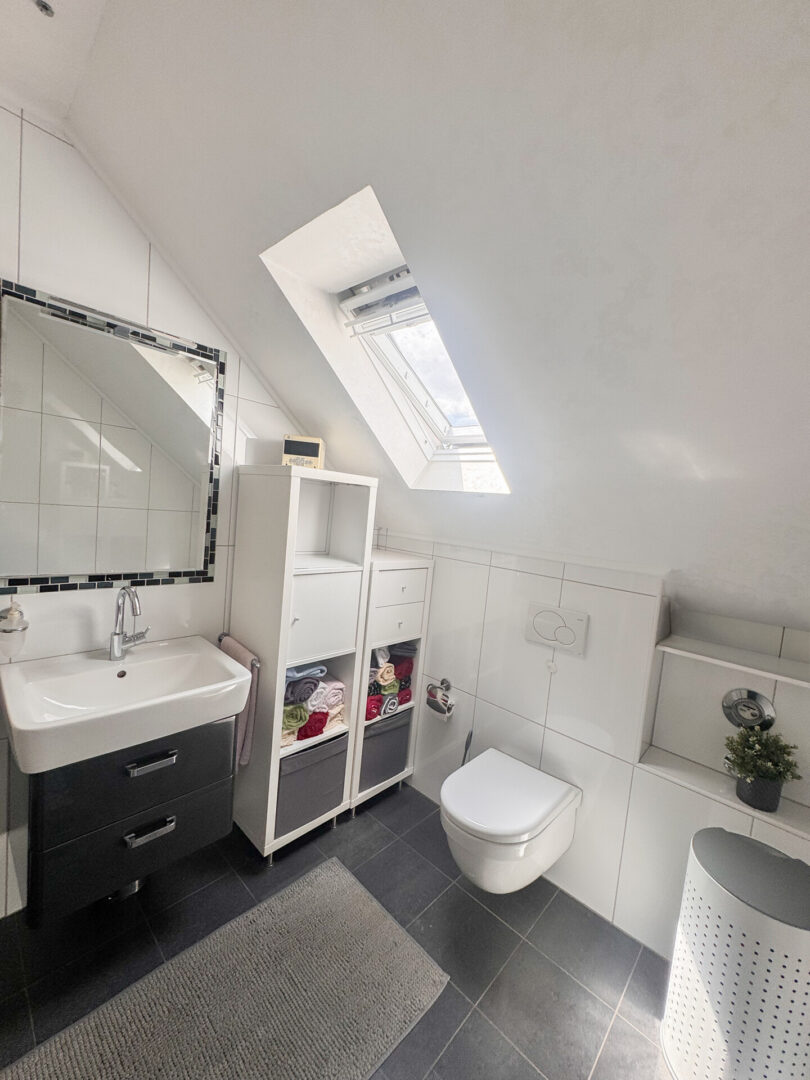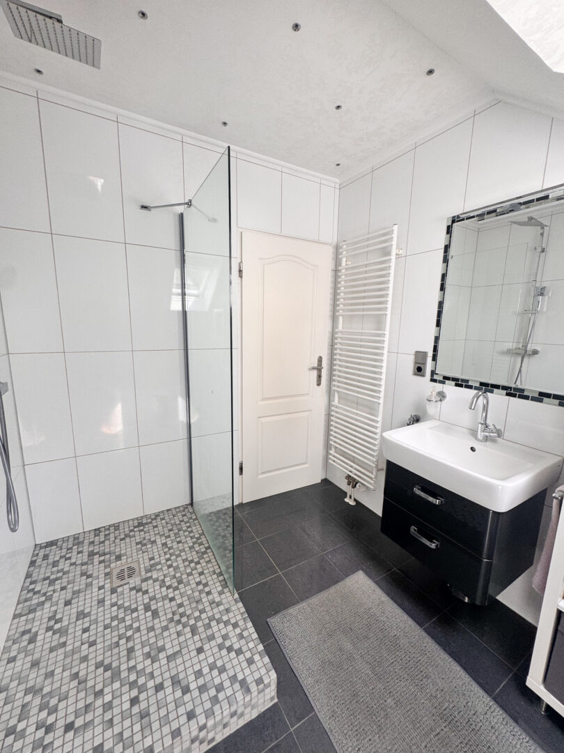 Das Badezimmer ist raumhoch mit weißen Fliesen im Format 30x60 cm versehen und verfügt über einen anthrazitfarbenen Fliesenboden. Ein Waschtisch, ein Hänge-WC von Geberit, eine Regendusche mit Glaswand sowie ein Handtuchheizkörper sorgen für Komfort im Alltag. Zudem finden sich hier der Spiegel mit grau-bläulichem Glasmosaik, eine marmorierte Wickeltechnik an der Decke sowie in die Decke eingelassene Strahler. Es handelt sich um ein Tageslichtbad mit Dachschrägenfenster, zusätzlich befindet sich hier die Kaltwasseruhr.