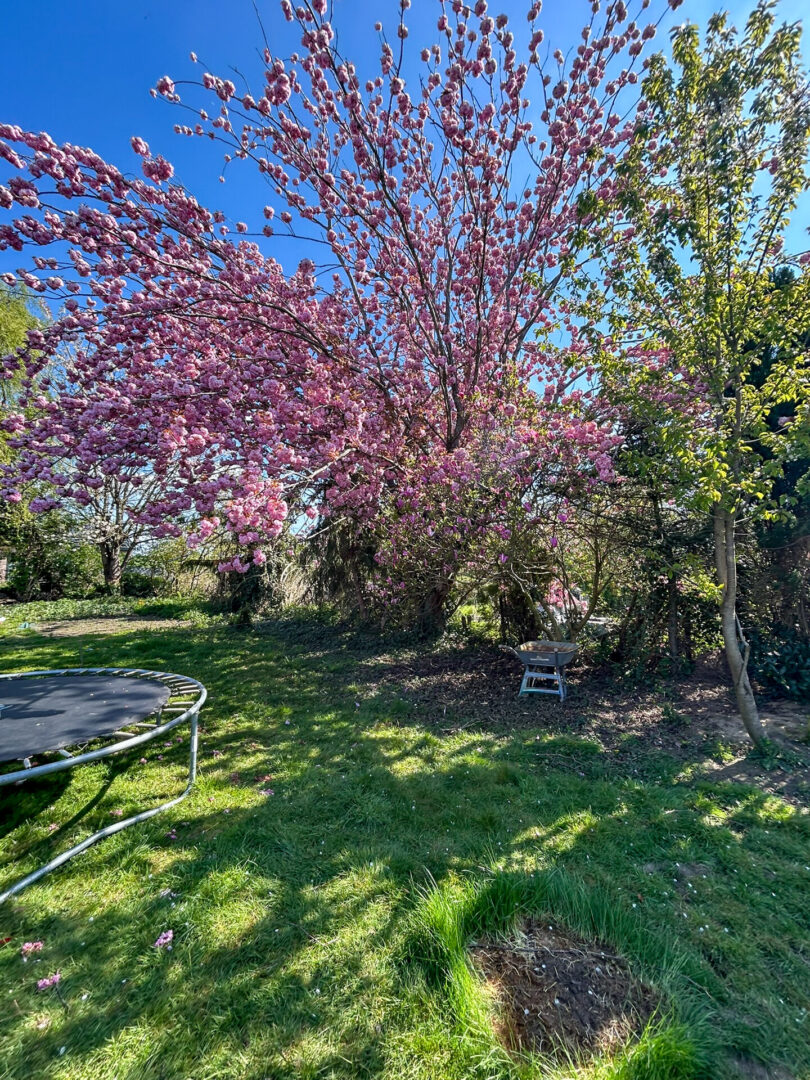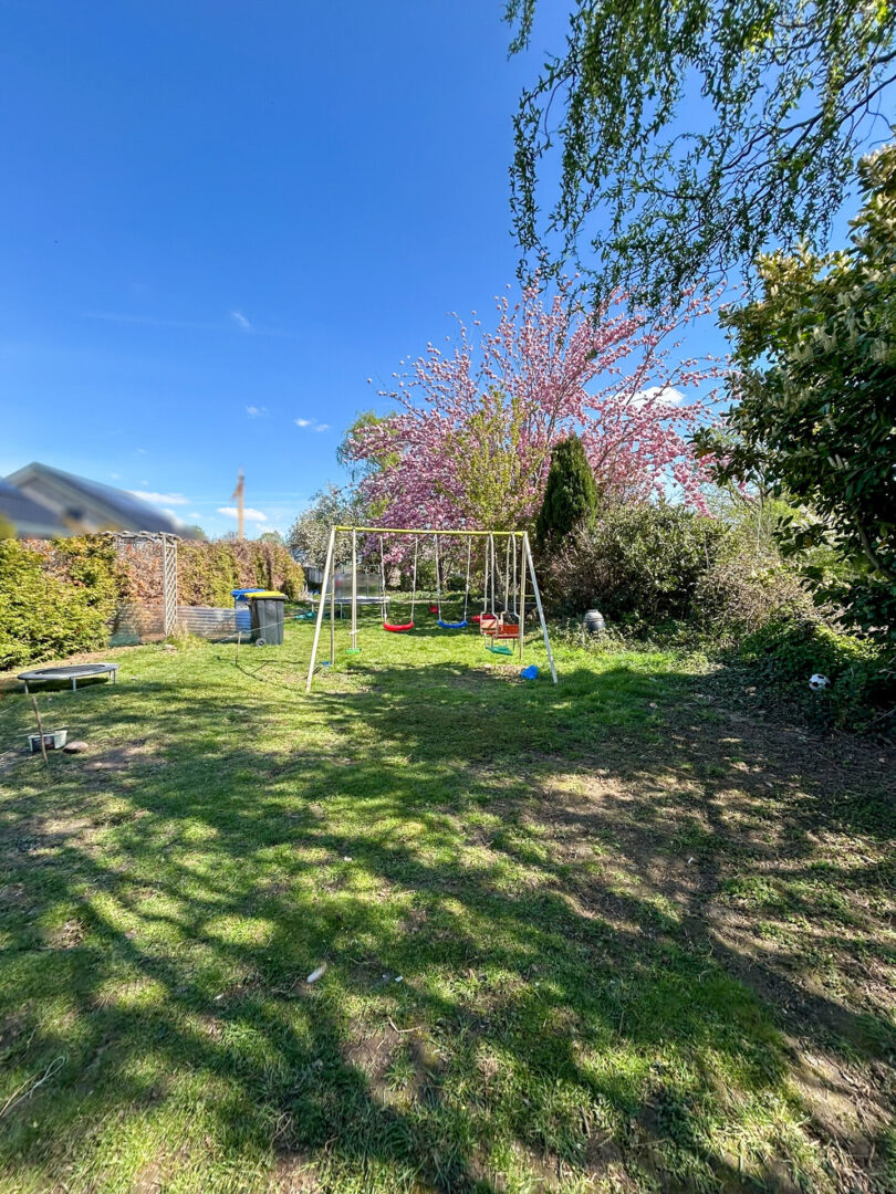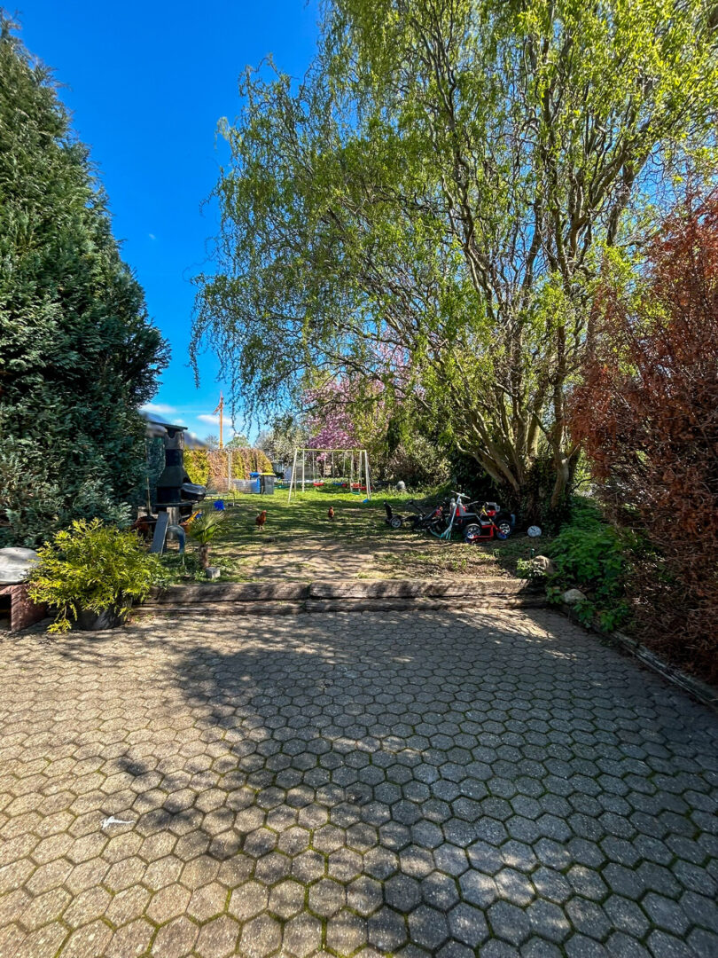 Ein großer, gepflasterter Terrassenbereich lädt zu entspannten Stunden im Freien ein. Der anschließende Garten überzeugt durch seine angenehme Größe. Er besteht überwiegend aus einer großzügigen Rasenfläche mit umlaufender Randbepflanzung und bietet damit ideale Voraussetzungen für Freizeit, Erholung oder individuelle Gartengestaltung.