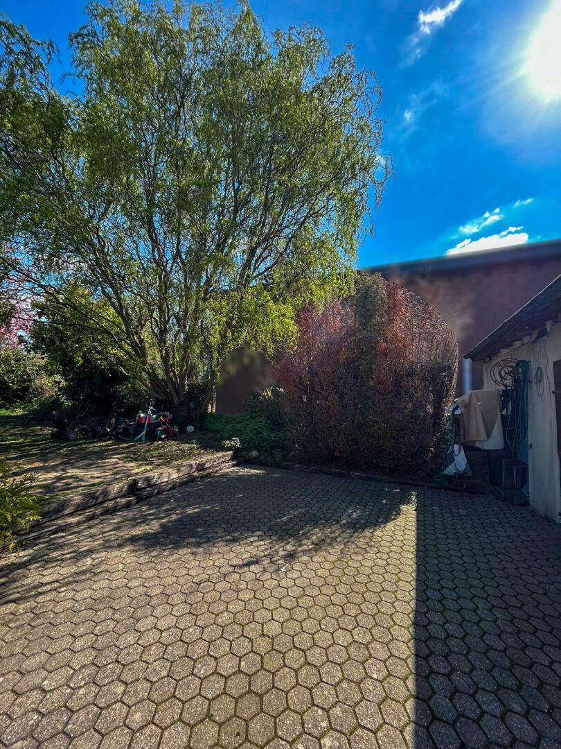 Ein gepflasterter Einfahrtsbereich neben dem Haus bietet Stellfläche für zwei PKW und ermöglicht ebenfalls den direkten Zugang zum Innenhof und in den Garten – ein klarer Pluspunkt im Alltag. Die Beheizung erfolgt über eine Flüssiggasanlage. Der im Garten platzierte Gastank ist durch eine Hecke blickgeschützt integriert. Für die Versorgung besteht ein Liefervertrag.