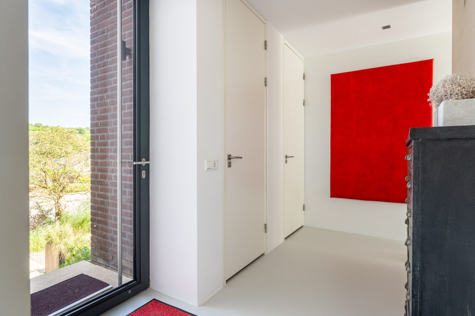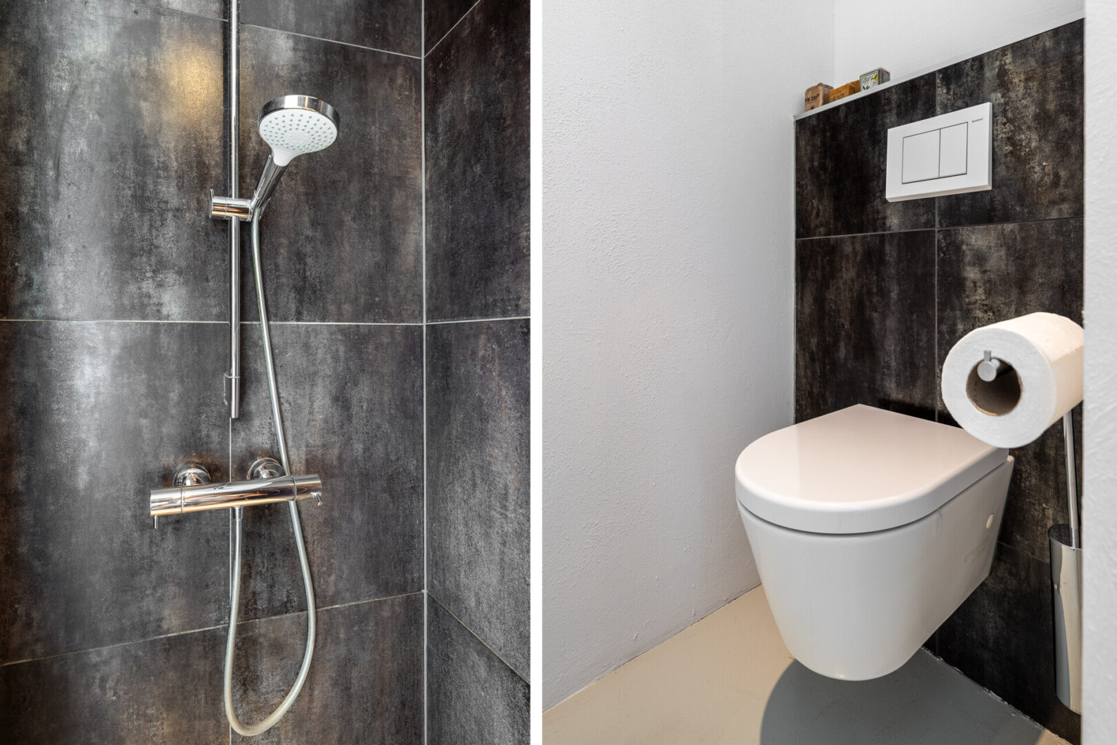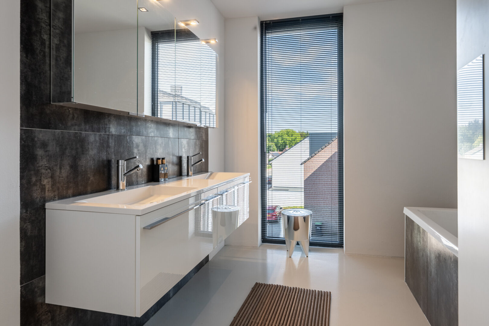 Im luxuriösen Badezimmer finden sich ein Doppelwaschbecken mit Unterschrank, eine Badewanne, eine ebenerdige Dusche, eine Toilette und ein Design-Heizkörper. Außerdem befindet sich hier der Technikraum mit einer neuen Nefit-Gastherme aus dem Jahr 2024, einem System zur Wärmerückgewinnung sowie der Steuerung für die Solaranlage.