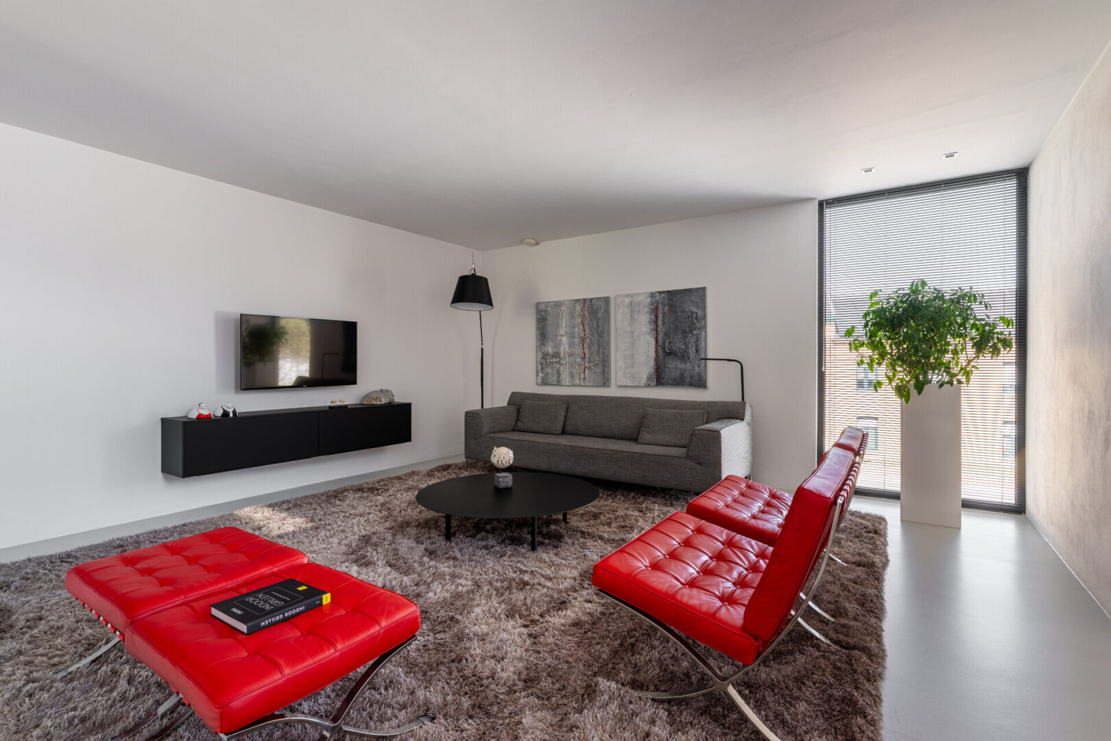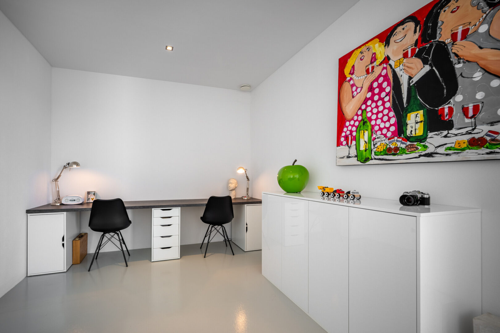 Auch diese Etage präsentiert sich mit einem hochwertigen Epoxidboden, Fußbodenheizung, eleganten Einbauleuchten und architektonisch außergewöhnlichen Innentüren, die sich beidseitig öffnen lassen.