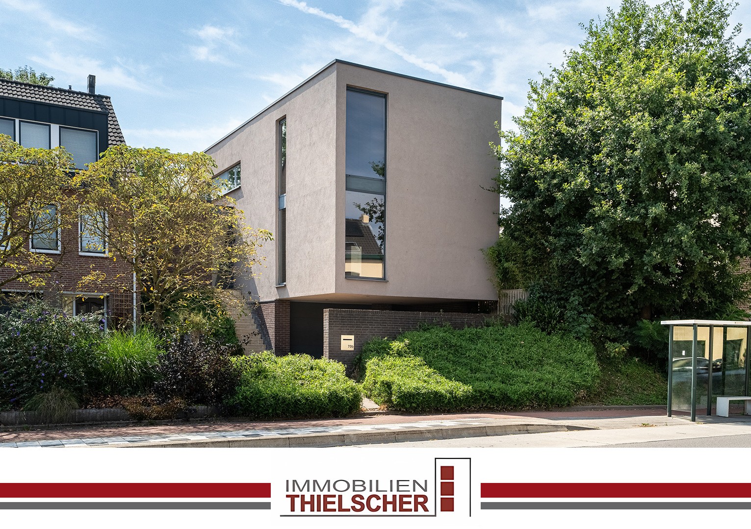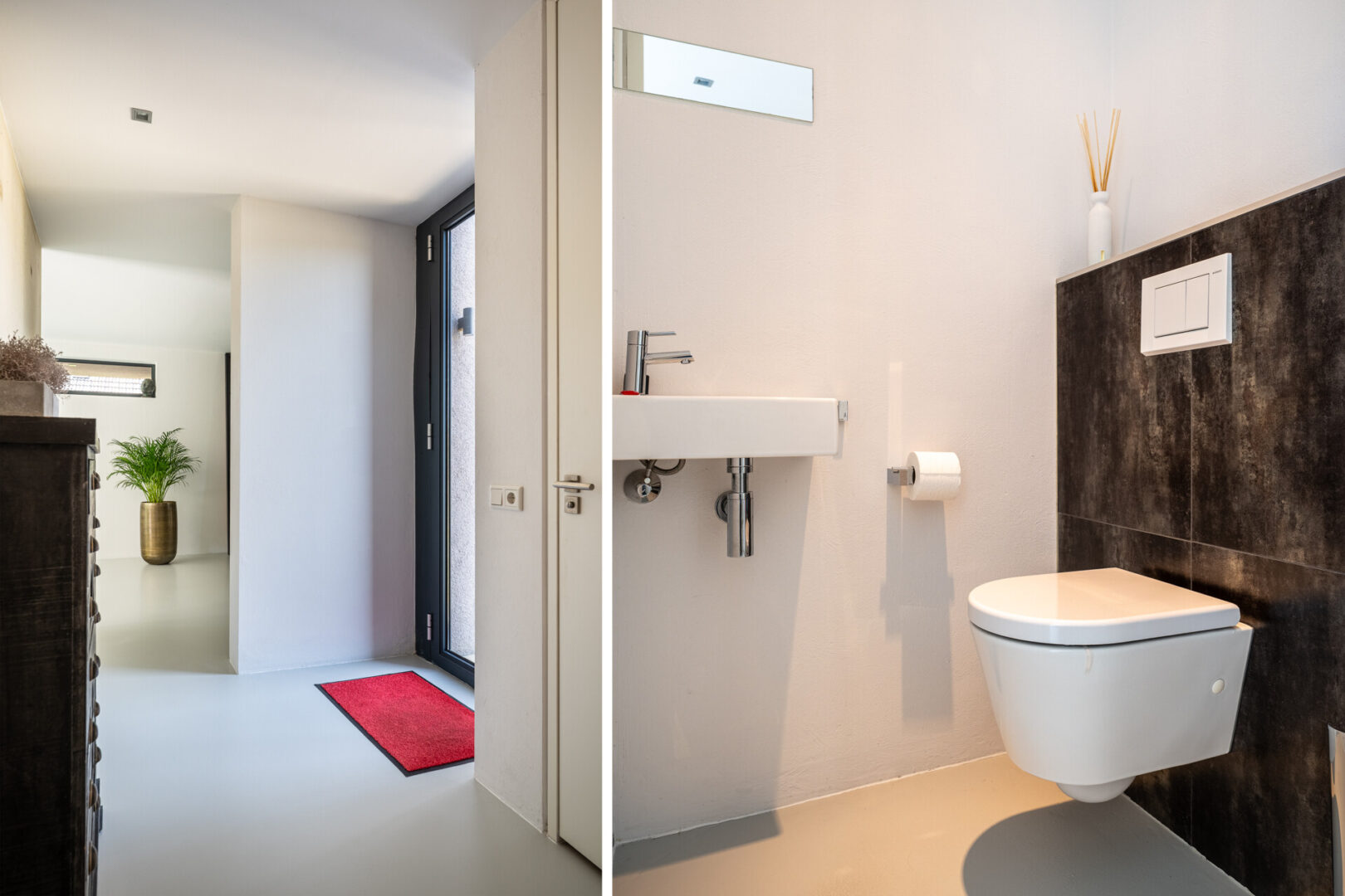 Die Betontreppe führt hinauf zum Eingangsbereich, wo eine beeindruckende Gestaltung den Besucher willkommen heißt. Von der Diele aus sind das Wohnzimmer, die Garderobe, der Zählerschrank, das Kellergeschoss, die Küche sowie das Gäste-WC mit WC und Waschtisch zugänglich.