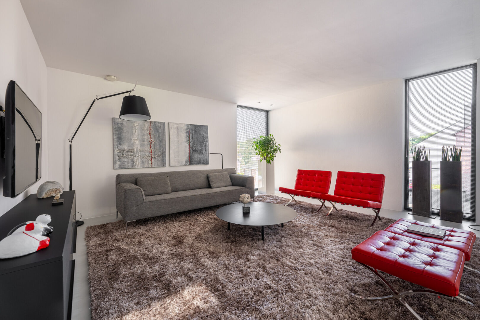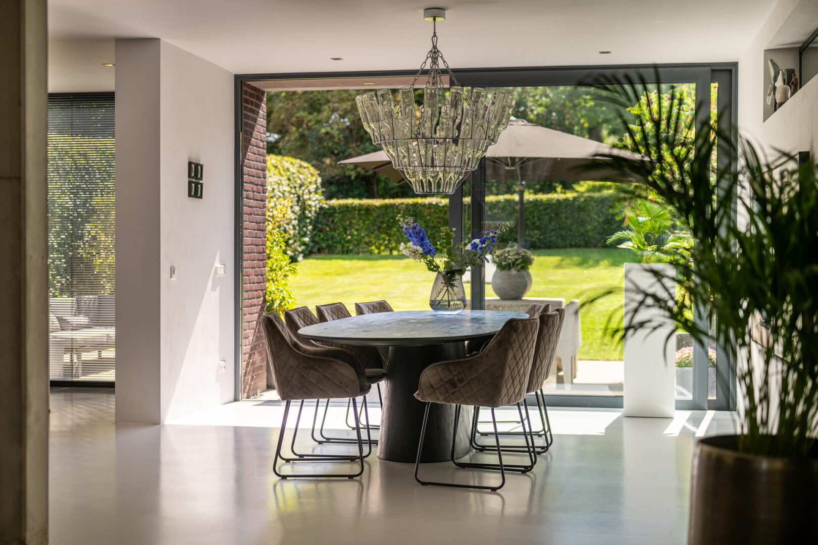 Das Wohnzimmer ist offen und geräumig gestaltet. Ein stilvoller Raumteiler mit Gaskamin trennt den Raum elegant und schafft eine behagliche Sitzecke. Angrenzend befindet sich das Esszimmer, das mit der Küche verbunden ist. Hier findet auch ein großer Esstisch bequem Platz und durch die große Schiebetür gelangt man direkt in den Garten.