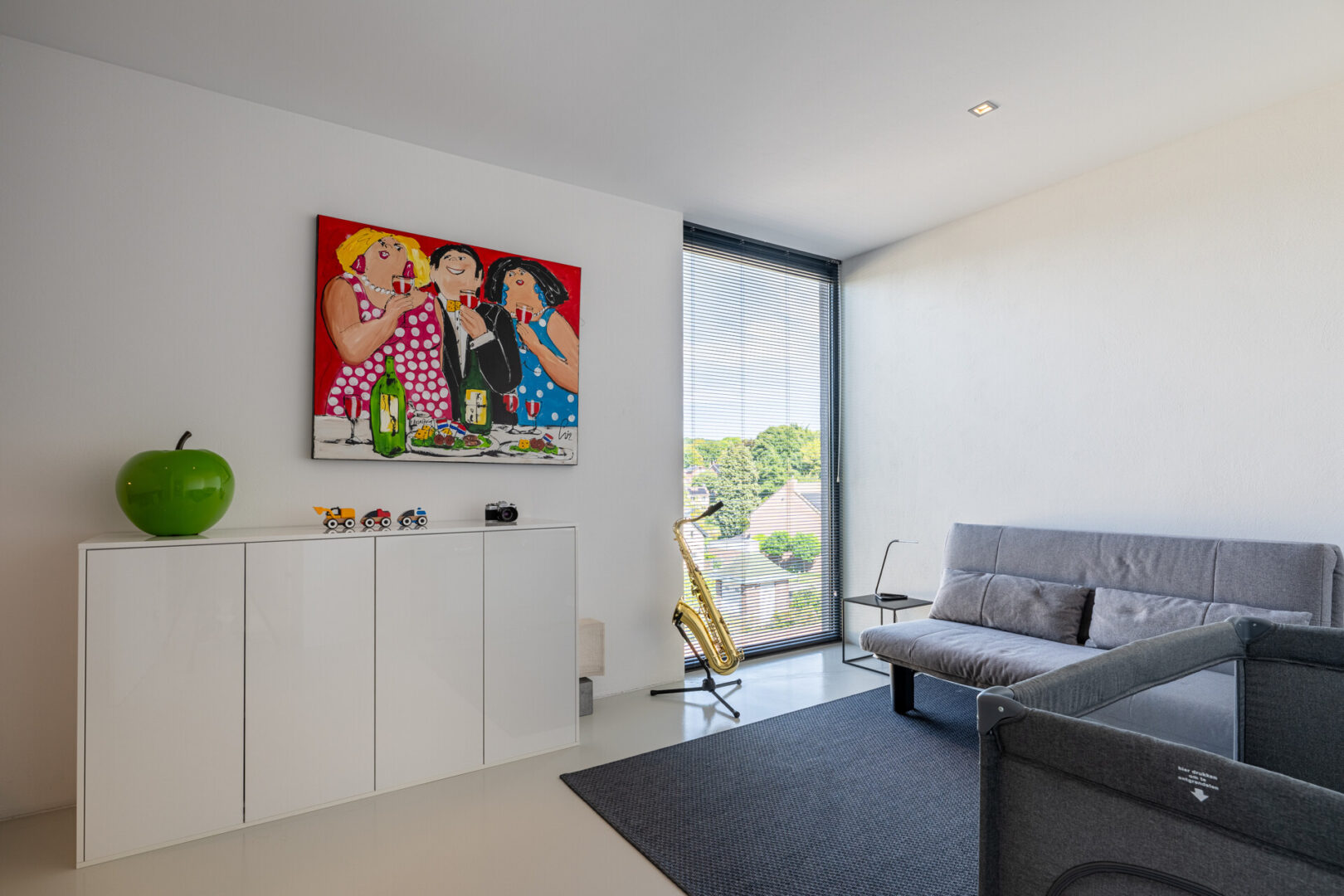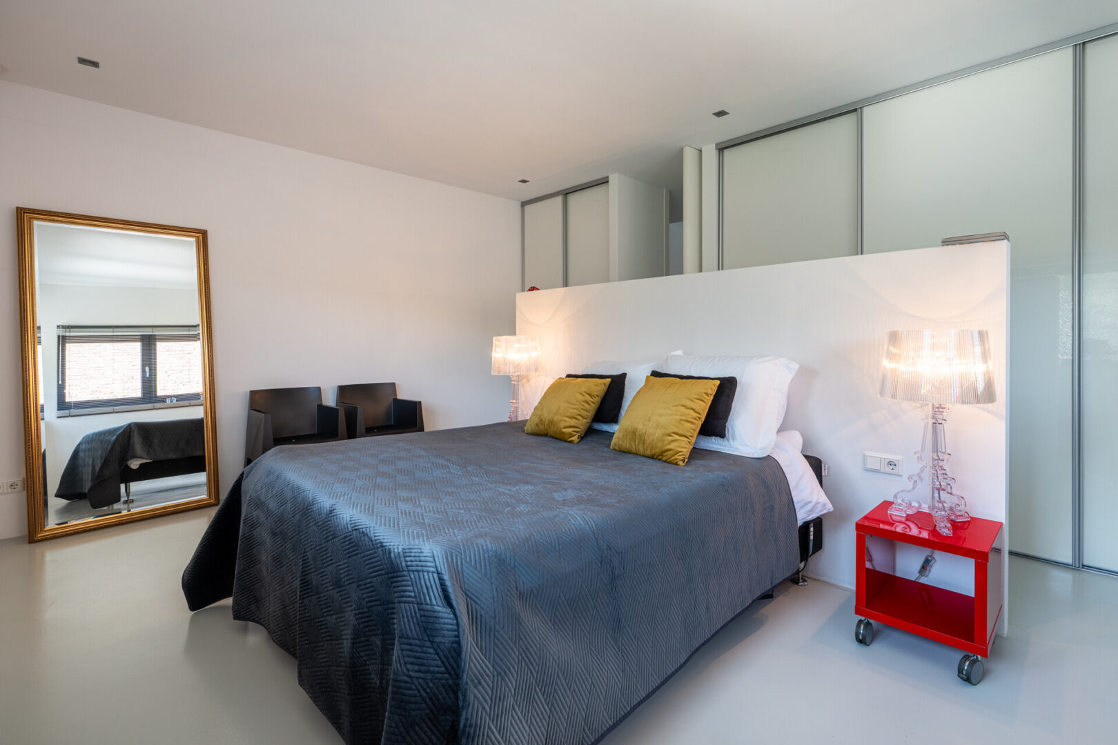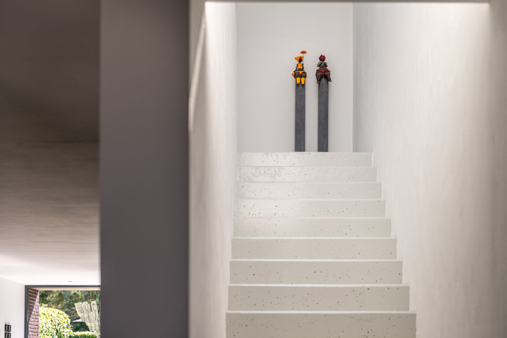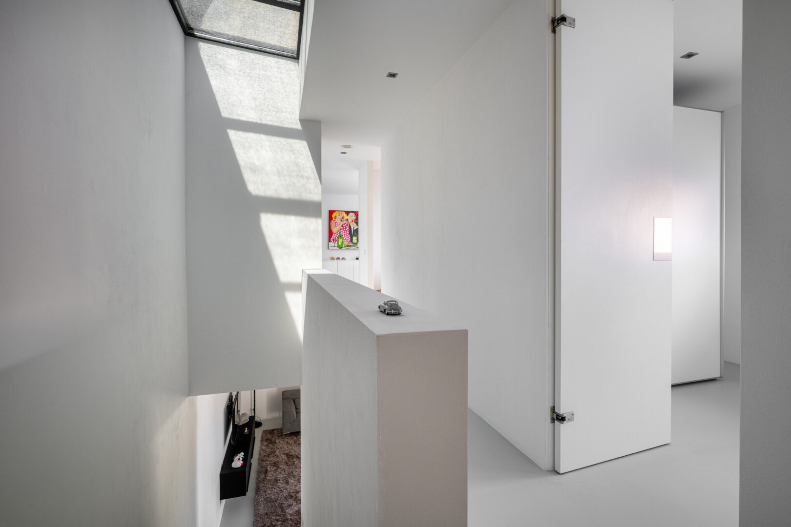 Über eine feste Betontreppe im Wohnzimmer gelangt man ins Obergeschoss. Der Flur ist durch eine große Lichtöffnung mit elektrisch steuerbarem Sonnenschutz, der über ein Smart-Home-System gesteuert wird, lichtdurchflutet. Diese Etage beherbergt drei Schlafzimmer mit ca. 25 m², 16 m² und 10 m² Fläche.