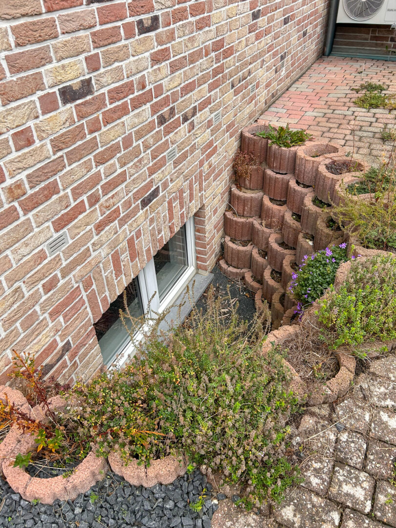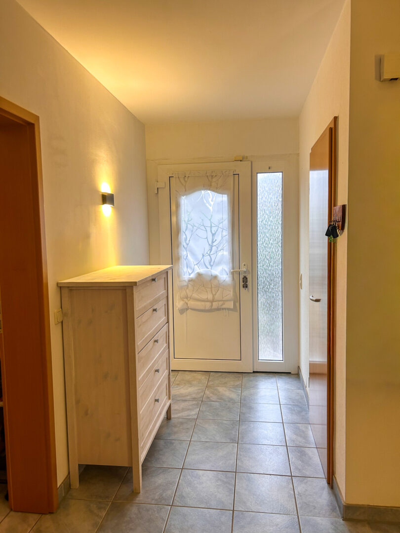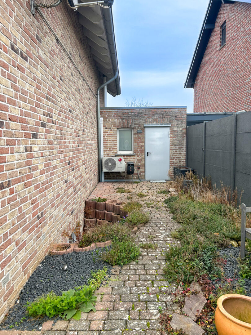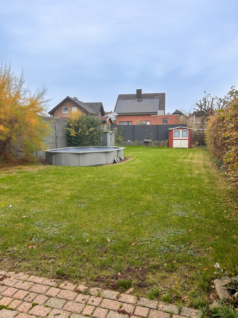 Die Doppelhaushälfte liegt angenehm zurückversetzt von der Straße und wird durch eine dichte, hohe Hecke vor Blicken geschützt. Die Einfahrt sowie der Weg zum Hauseingang ist mit Betonsteinen gepflastert. Im Vorgarten befindet sich ein Metallgerätehaus für Fahrräder oder Mülltonnen sowie eine kleine Rasen- und Beetfläche, die zusätzlichen Charme und praktische Nutzungsmöglichkeiten bietet.