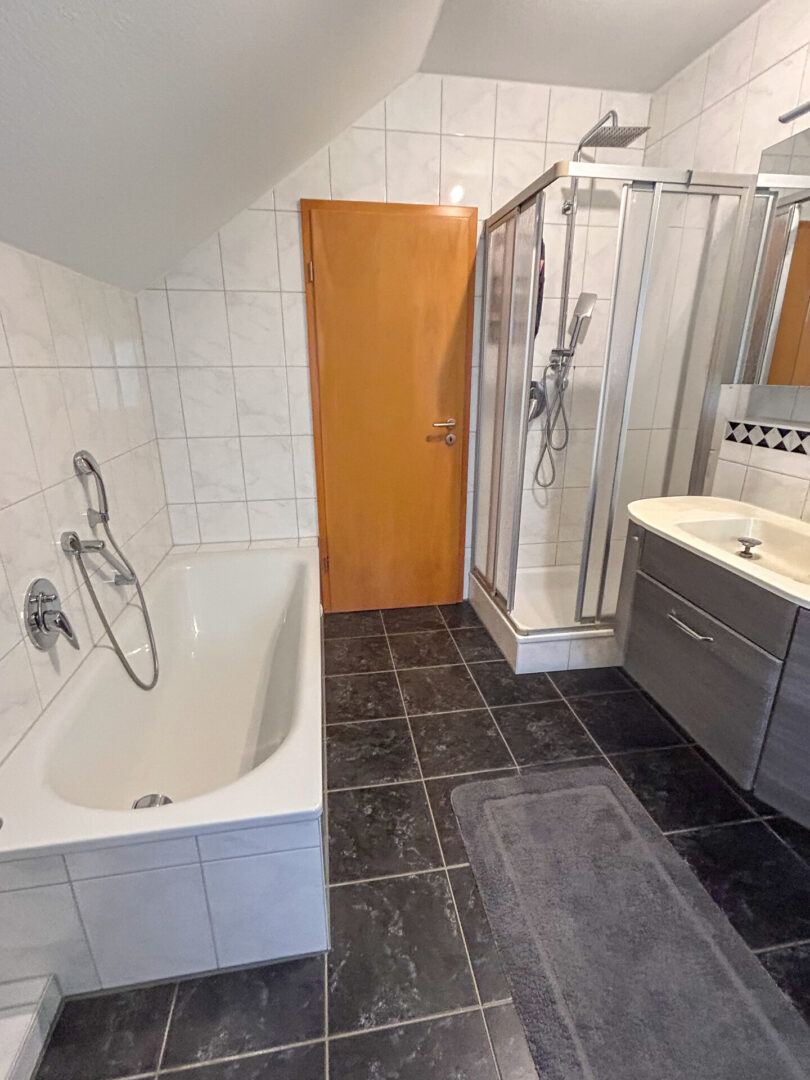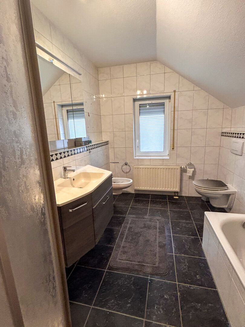 hier befinden sich das Elternschlafzimmer mit Ankleidebereich, ein modernes Badezimmer mit Badewanne, Dusche, Bidet und Toilette, sowie zwei Kinderzimmer.