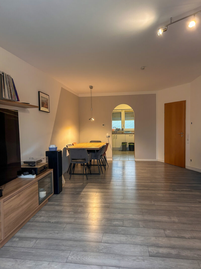 Großzügiger Wohn- und Essbereich mit Zugang zur Terrasse und in den Garten, Küche, Diele sowie ein Gäste-WC.