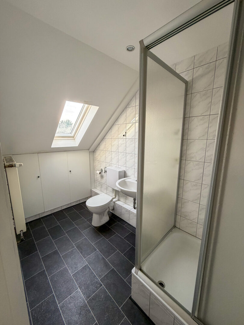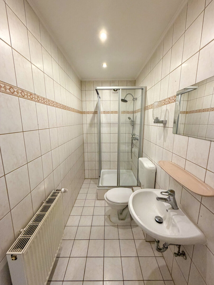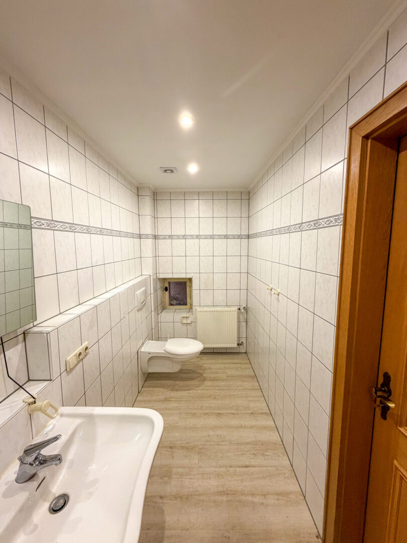 - 2 Bäder, deckenhoch hell gefliest, mit Vinylboden im DG und Fliesenboden im OG und Dusche