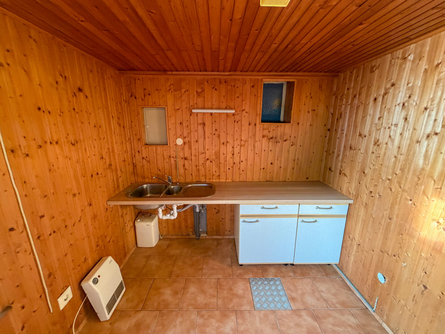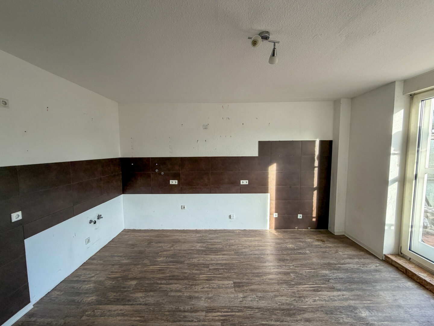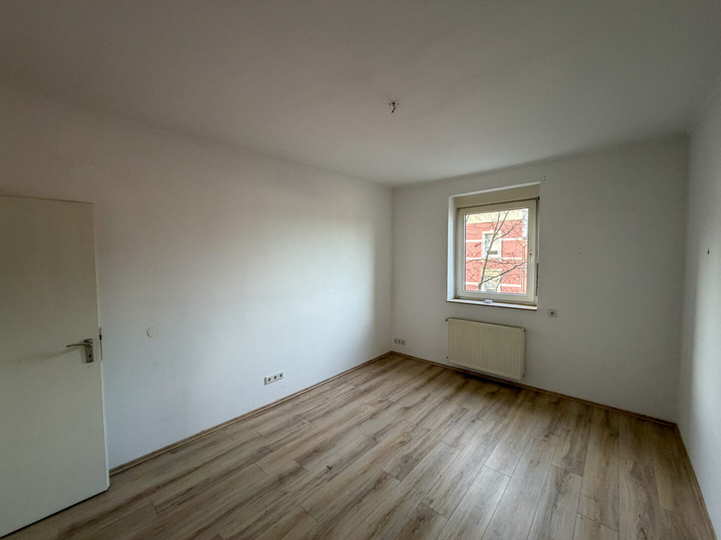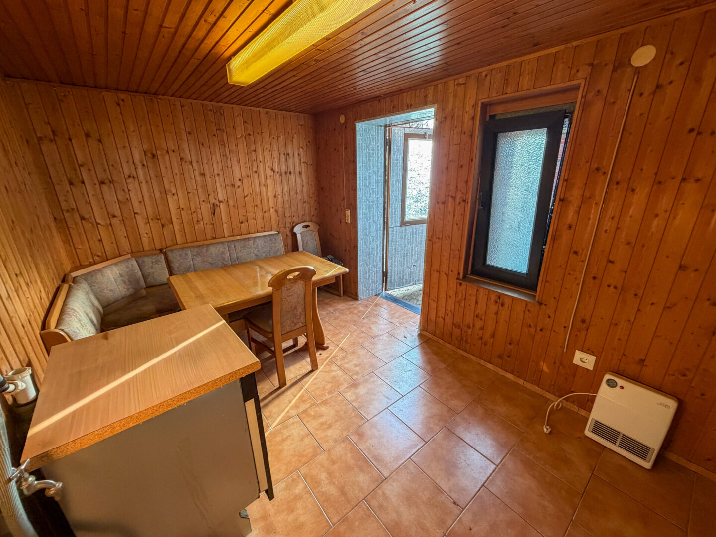 - Fliesenboden im Wohnraum, Laminatboden im Schlafzimmer, Eiche-Echtholztüren, Küche hell gefliest