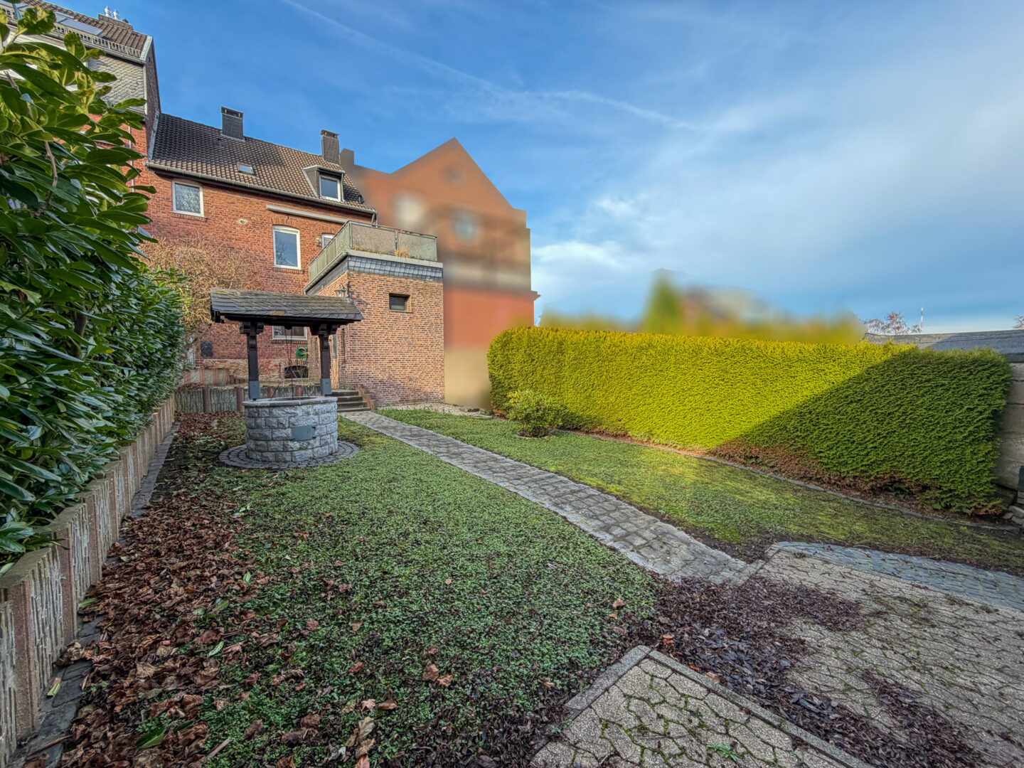 - Garten mit Rasenfläche, Hecke und Beeten
