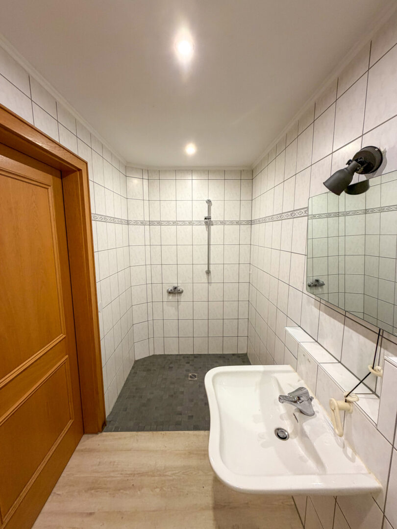 - Badezimmer deckenhoch hell gefliest mit Badmöbeln und ebenerdiger Dusche von 2011