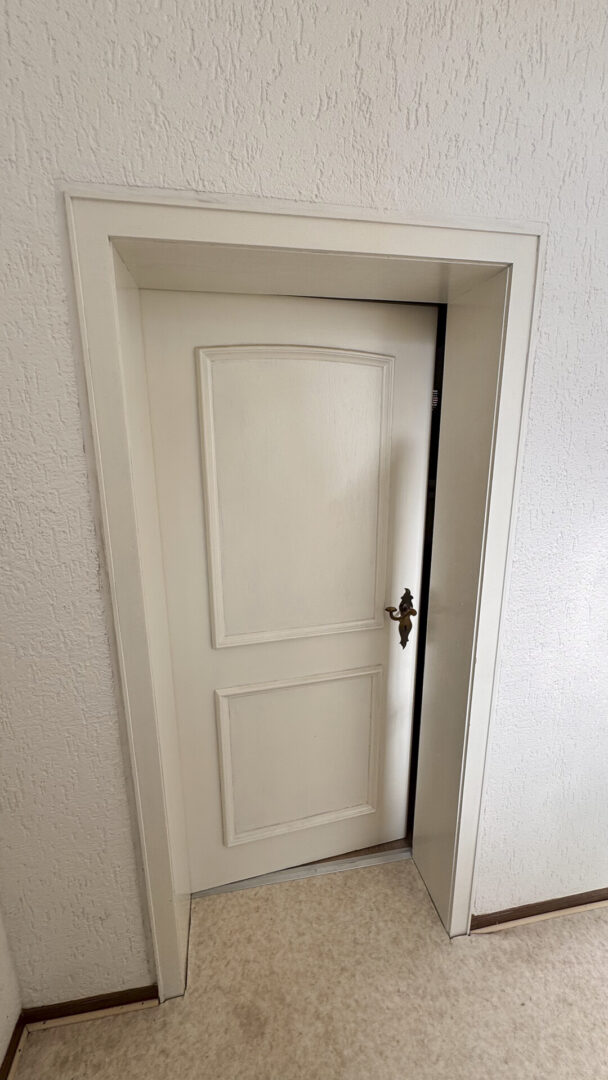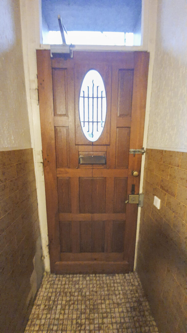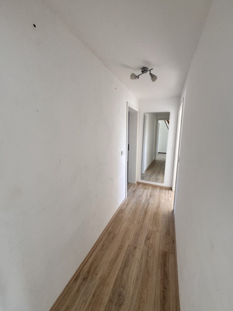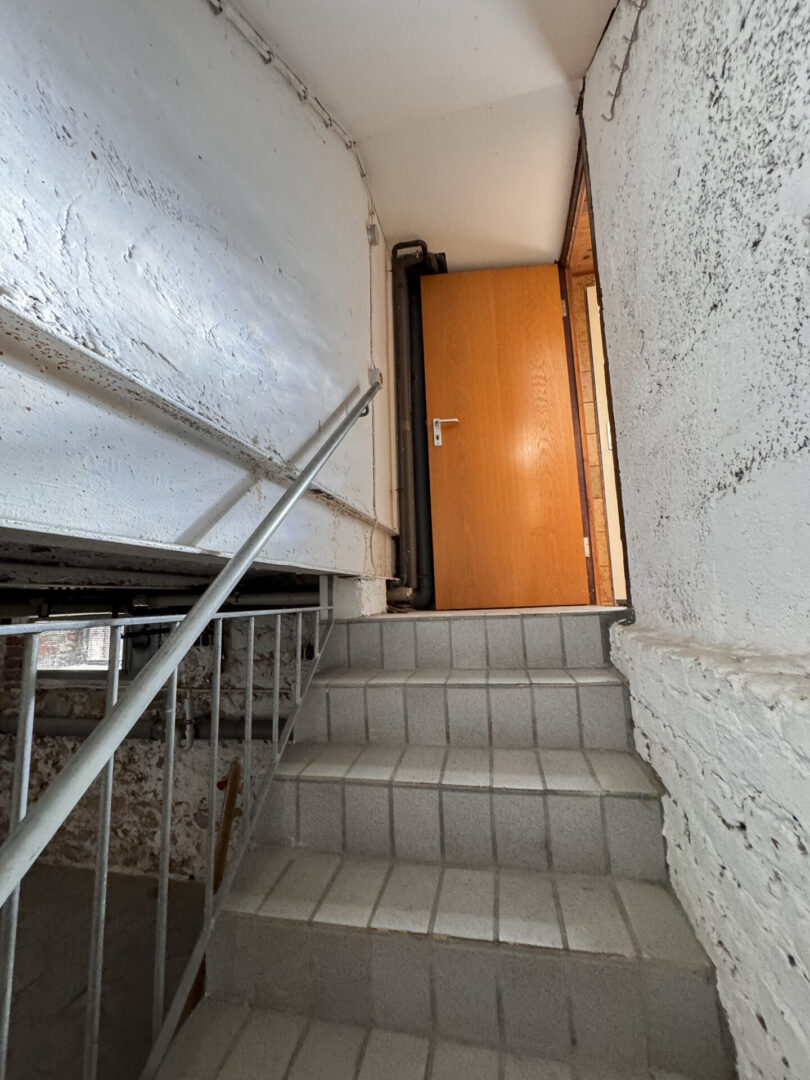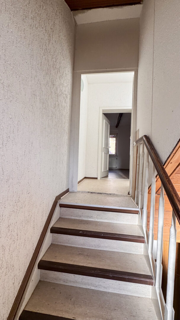 Über einen straßenseitig gelegenen Hauseingang gelangen Sie in das Treppenhaus mit Holztreppe ins Ober- und Dachgeschoss.