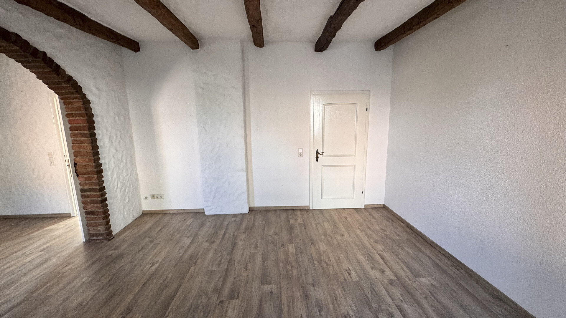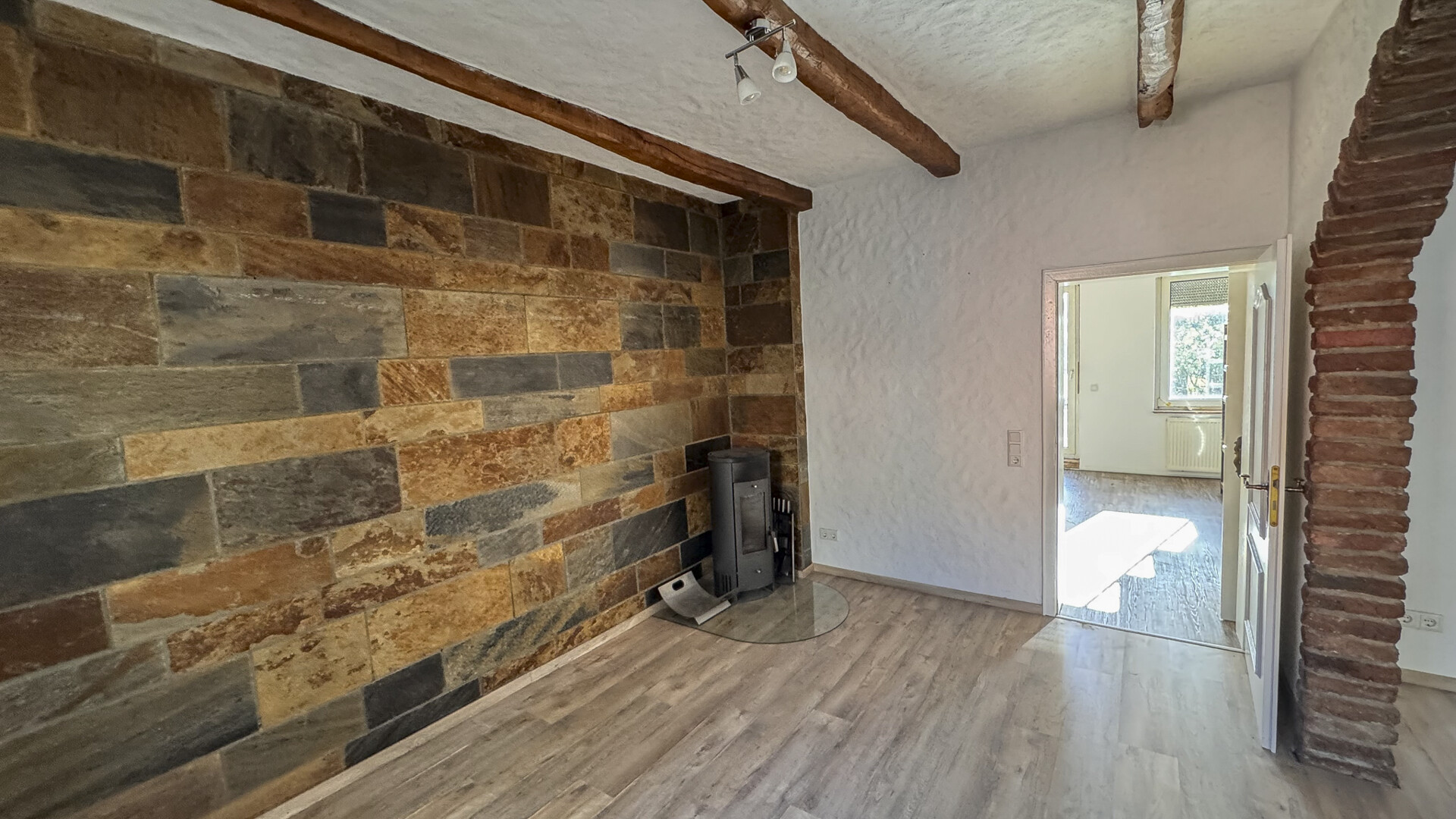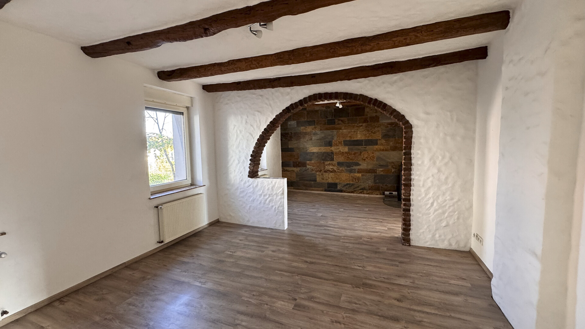 Über einen straßenseitig gelegenen Hauseingang gelangen Sie in das Treppenhaus mit Holztreppe ins Ober- und Dachgeschoss.