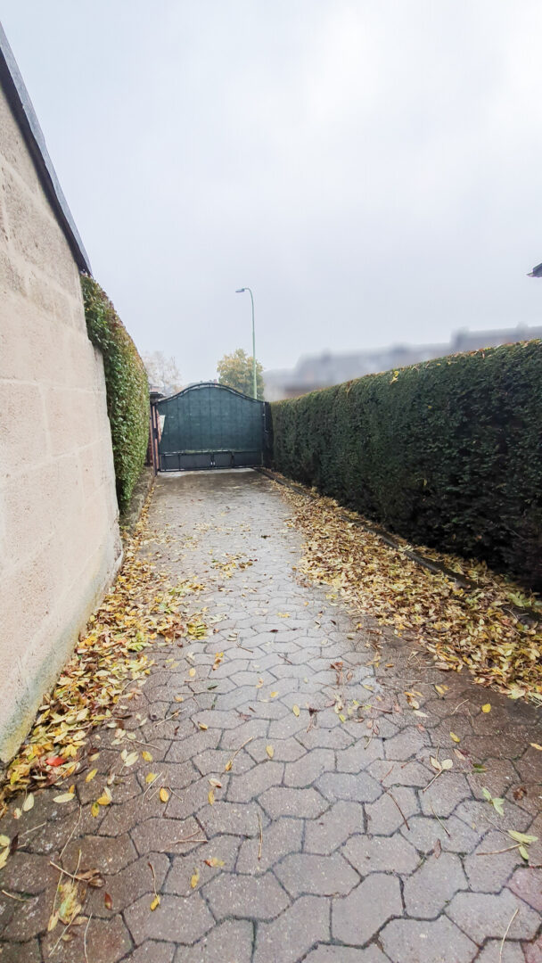 Zum Haus gehört eine große Garage, die über einen privaten Zufahrtsweg von der Seitenstraße aus erreichbar ist. Die Zufahrt wird durch ein schmiedeeisernes, elektrisches Tor abgeschlossen und sorgt für zusätzliche Privatsphäre und Sicherheit.